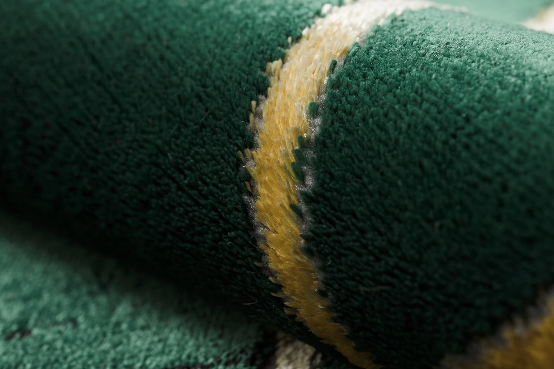 Zielono-złoty dywan z geometrycznym wzorem marmuru, który nadaje korytarzowi elegancki i wyróżniający się charakter.