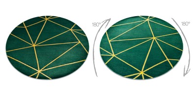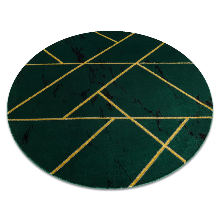 Okrągły dywan w butelkowej zieleni ze złotym geometrycznym wzorem, który doda salonowi elegancki i nowoczesny charakter.