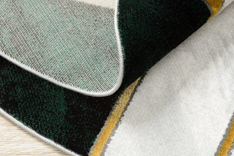 Okrągły dywan w złotym kolorze z geometrycznym wzorem, który doda salonowi luksusowy charakter i stanie się eleganckim punktem centralnym wnętrza.
