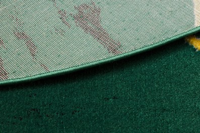 Okrągły dywan w butelkowej zieleni ze złotym geometrycznym wzorem, który doda salonowi elegancki i nowoczesny charakter.