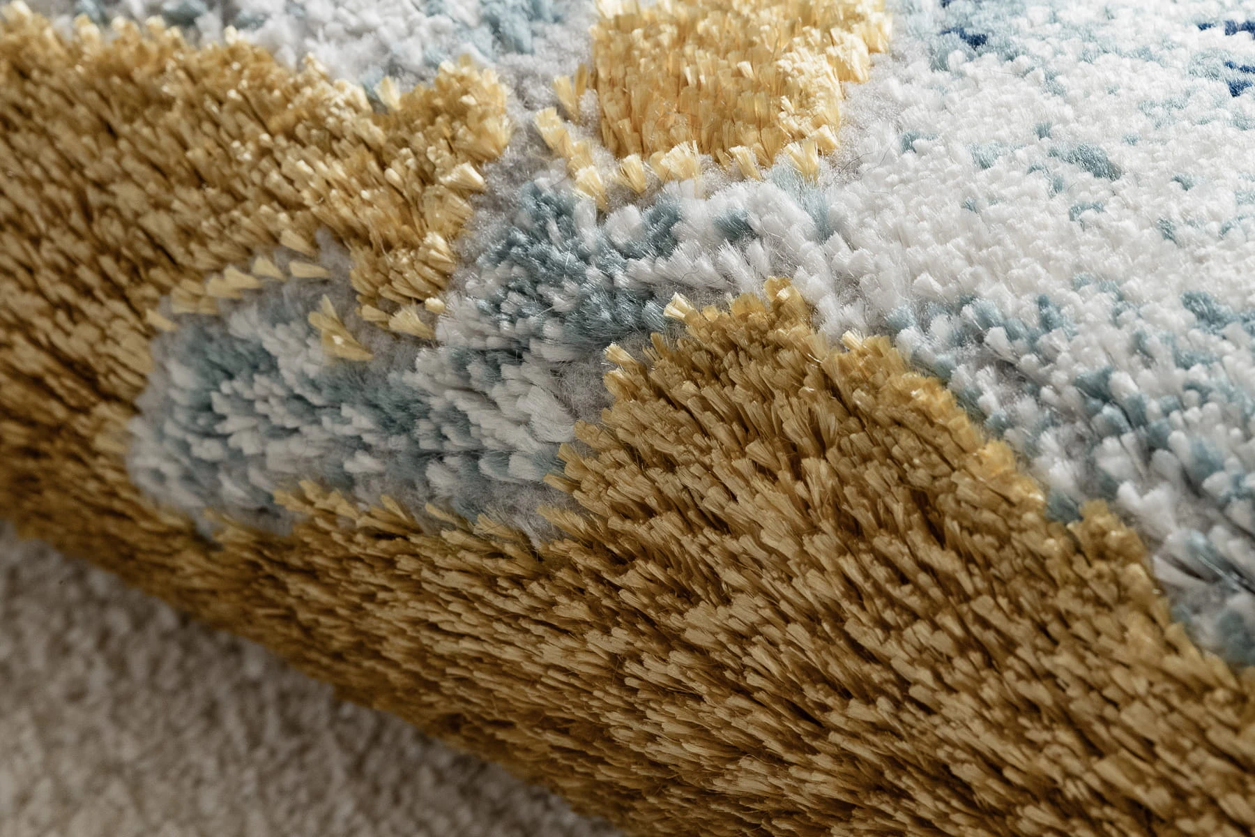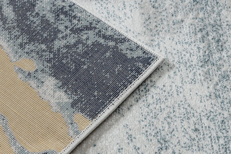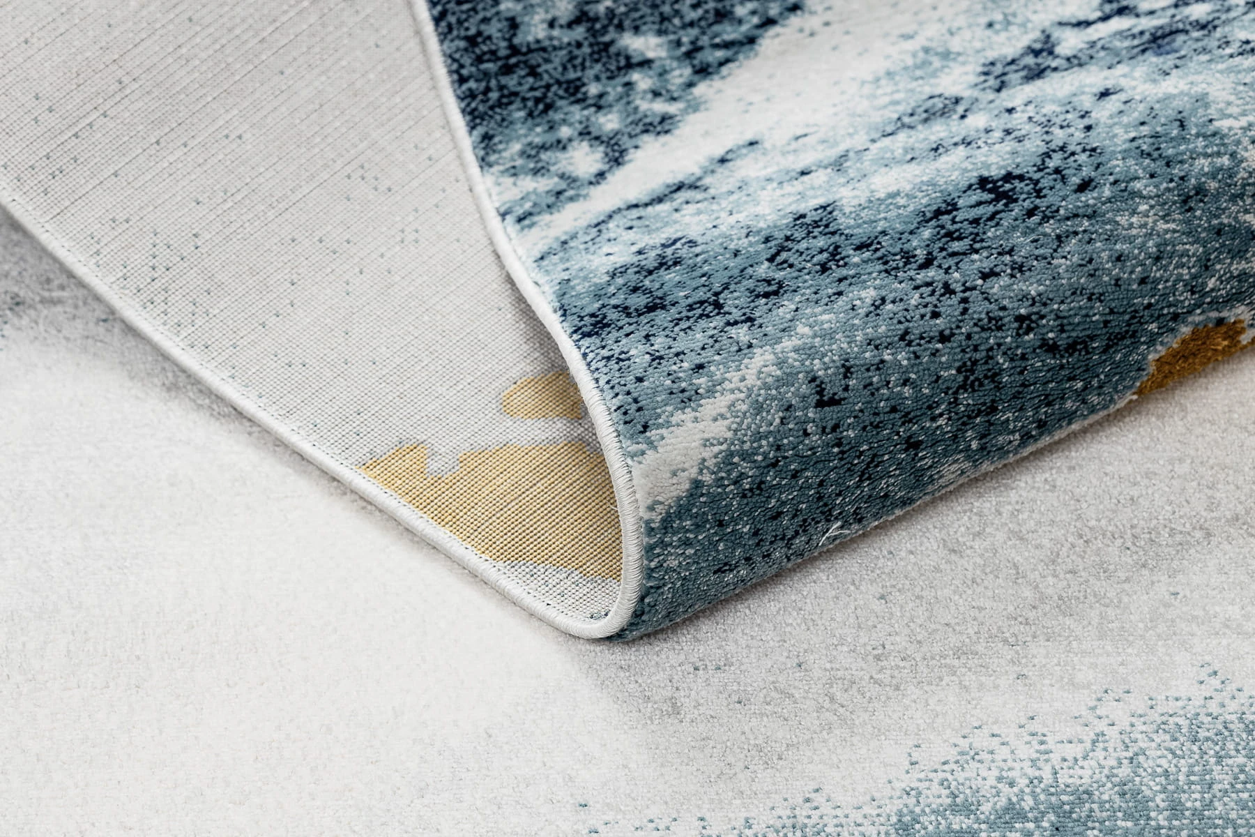 Niebiesko-złoty dywan z abstrakcyjnym wzorem, który nadaje salonowi elegancki i nowoczesny charakter.
