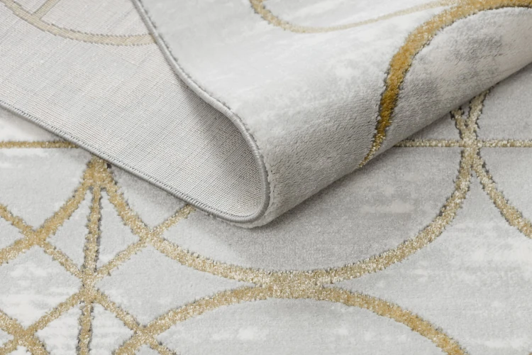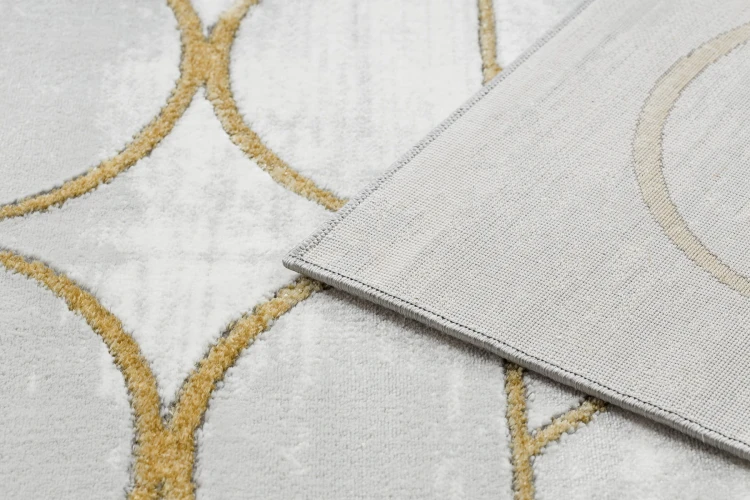 Kremowy dywan ze złotymi kołami, który doda salonowi nowoczesny charakter i ciepły, elegancki akcent.