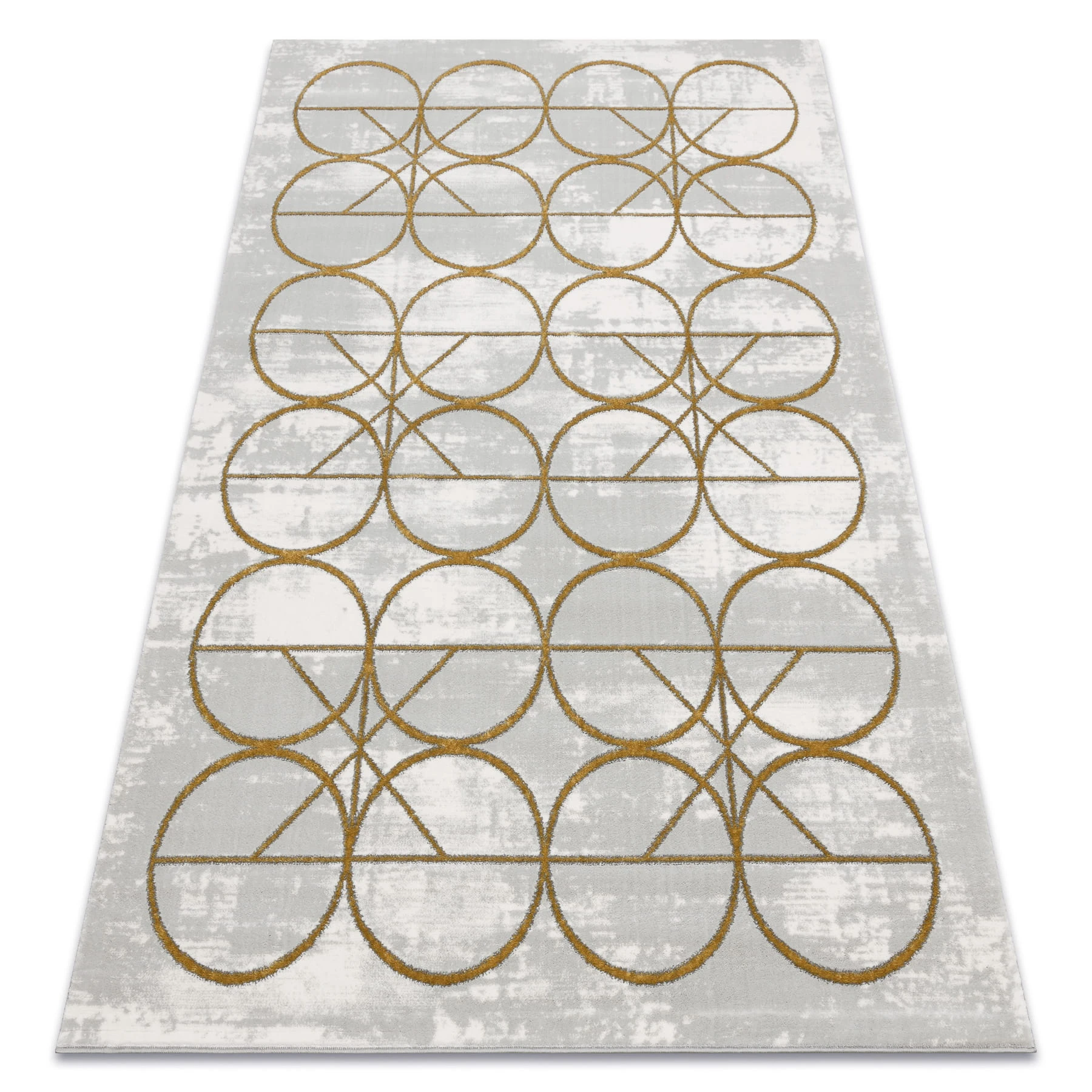 Kremowy dywan ze złotymi kołami, który doda salonowi nowoczesny charakter i ciepły, elegancki akcent.
