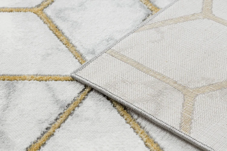 Kremowo-złoty dywan z geometrycznym wzorem, który doda salonowi elegancki charakter i ciepły akcent.