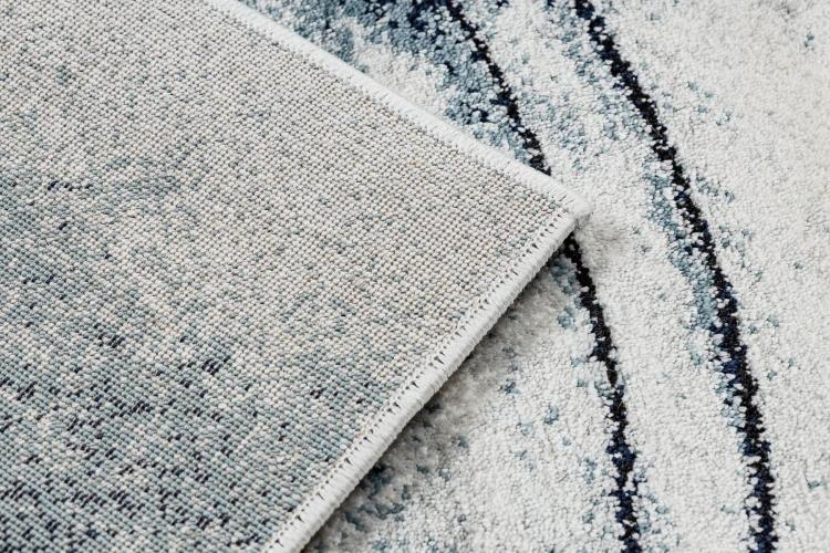 Niebieski dywan z abstrakcyjnym wzorem w złocistych kołach, który doda wnętrzu elegancki i nowoczesny charakter.