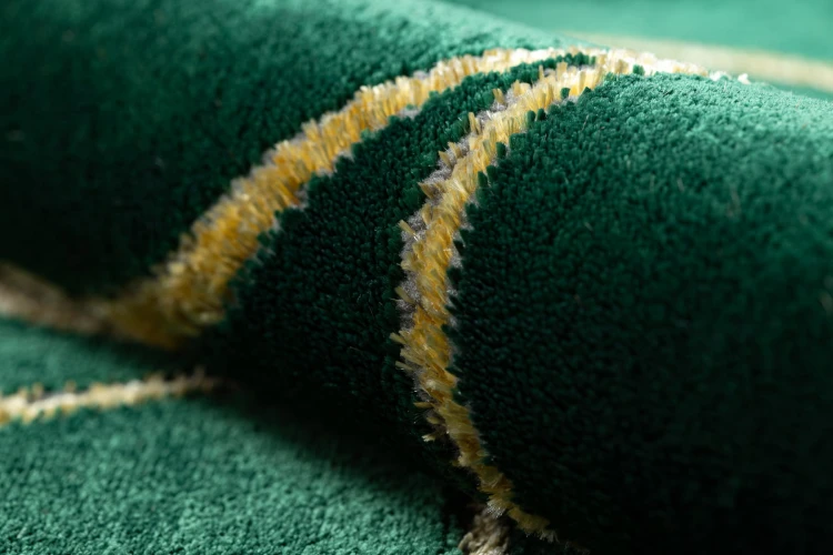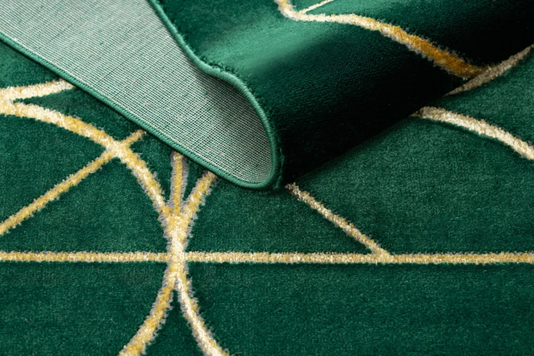 Zielony dywan z geometrycznym wzorem kół w odcieniu złota, który wprowadzi elegancki akcent kolorystyczny do salonu lub pokoju.