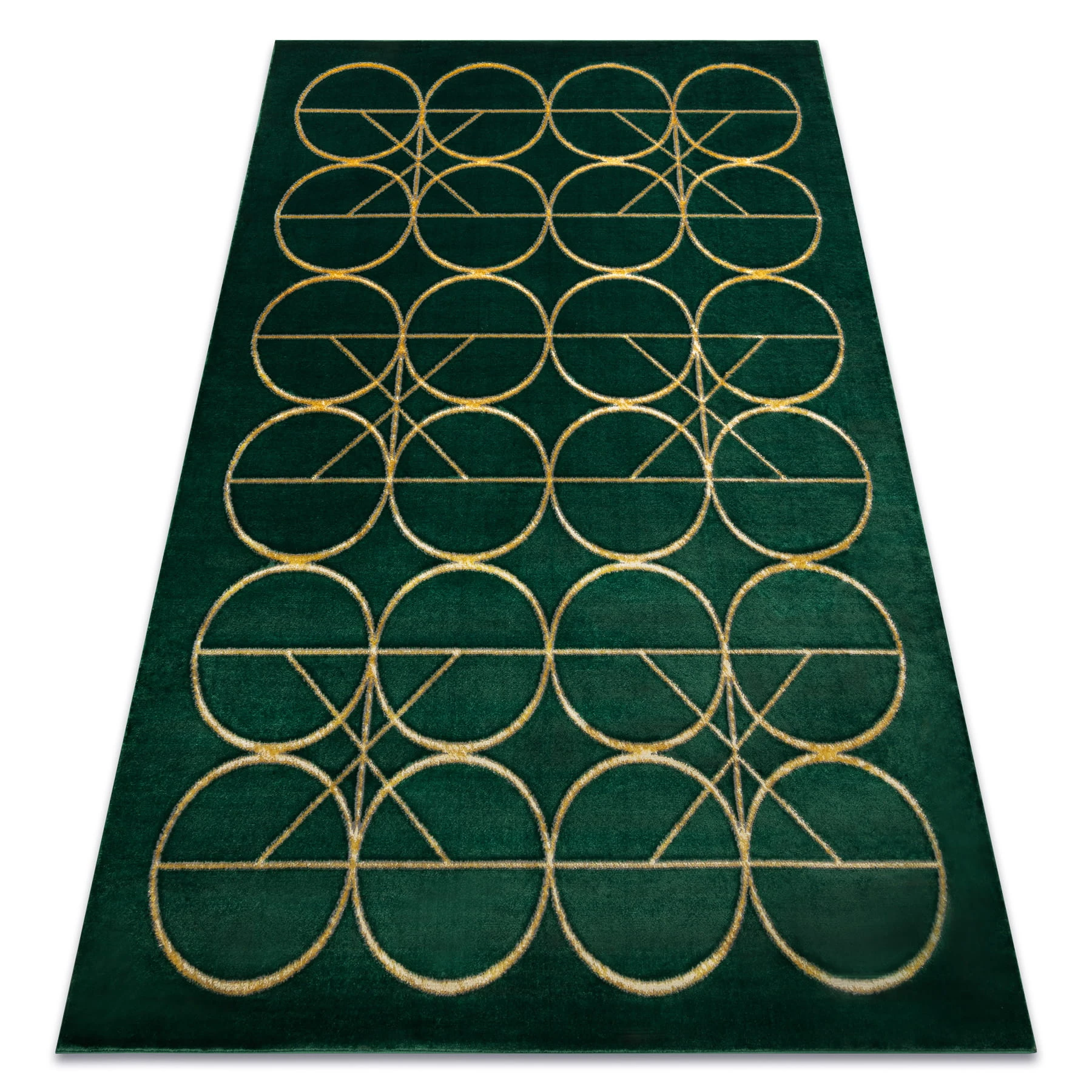 Zielony dywan z geometrycznym wzorem kół w odcieniu złota, który wprowadzi elegancki akcent kolorystyczny do salonu lub pokoju.