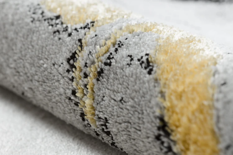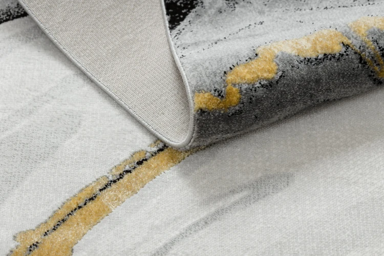 Szary dywan z abstrakcyjnym wzorem marmuru, który doda salonowi nowoczesny, elegancki charakter.