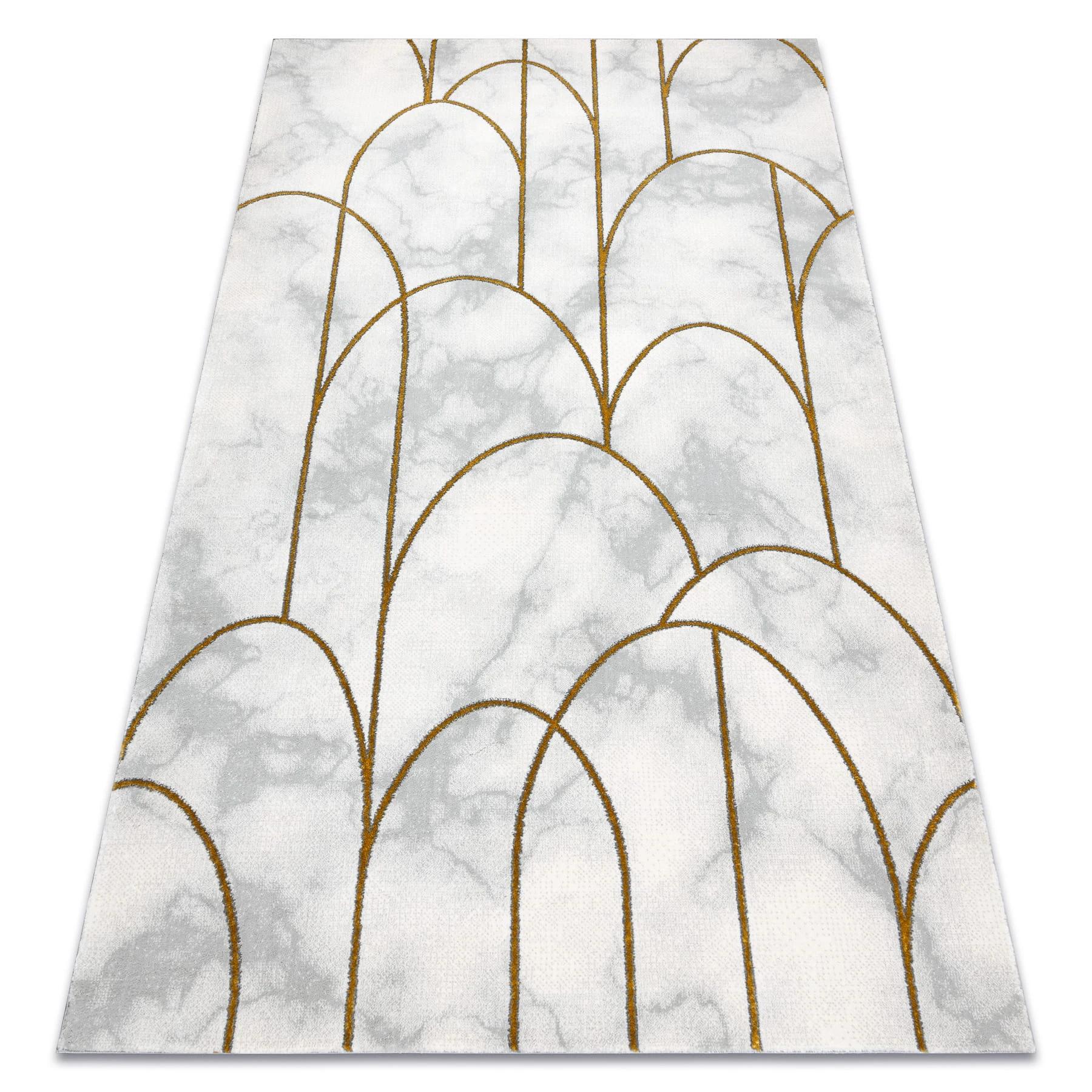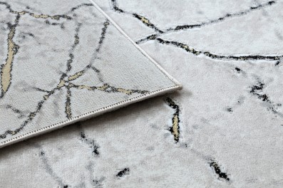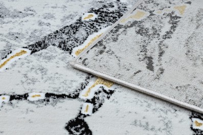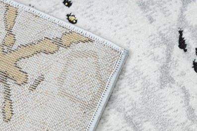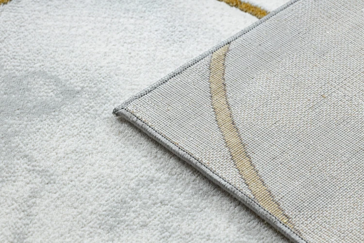 Kremowy dywan z abstrakcyjnym wzorem w złocistych odcieniach, który doda salonowi elegancki charakter.