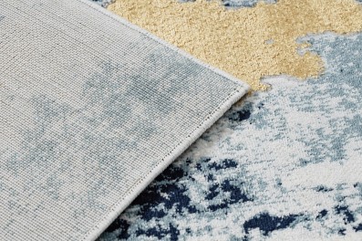 Granatowy dywan z abstrakcyjnym wzorem i złotymi akcentami, który nada wnętrzu elegancki i nowoczesny charakter.