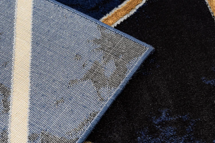 Złoto-niebieski dywan z geometrycznym wzorem, który nada salonowi elegancki i nowoczesny charakter.