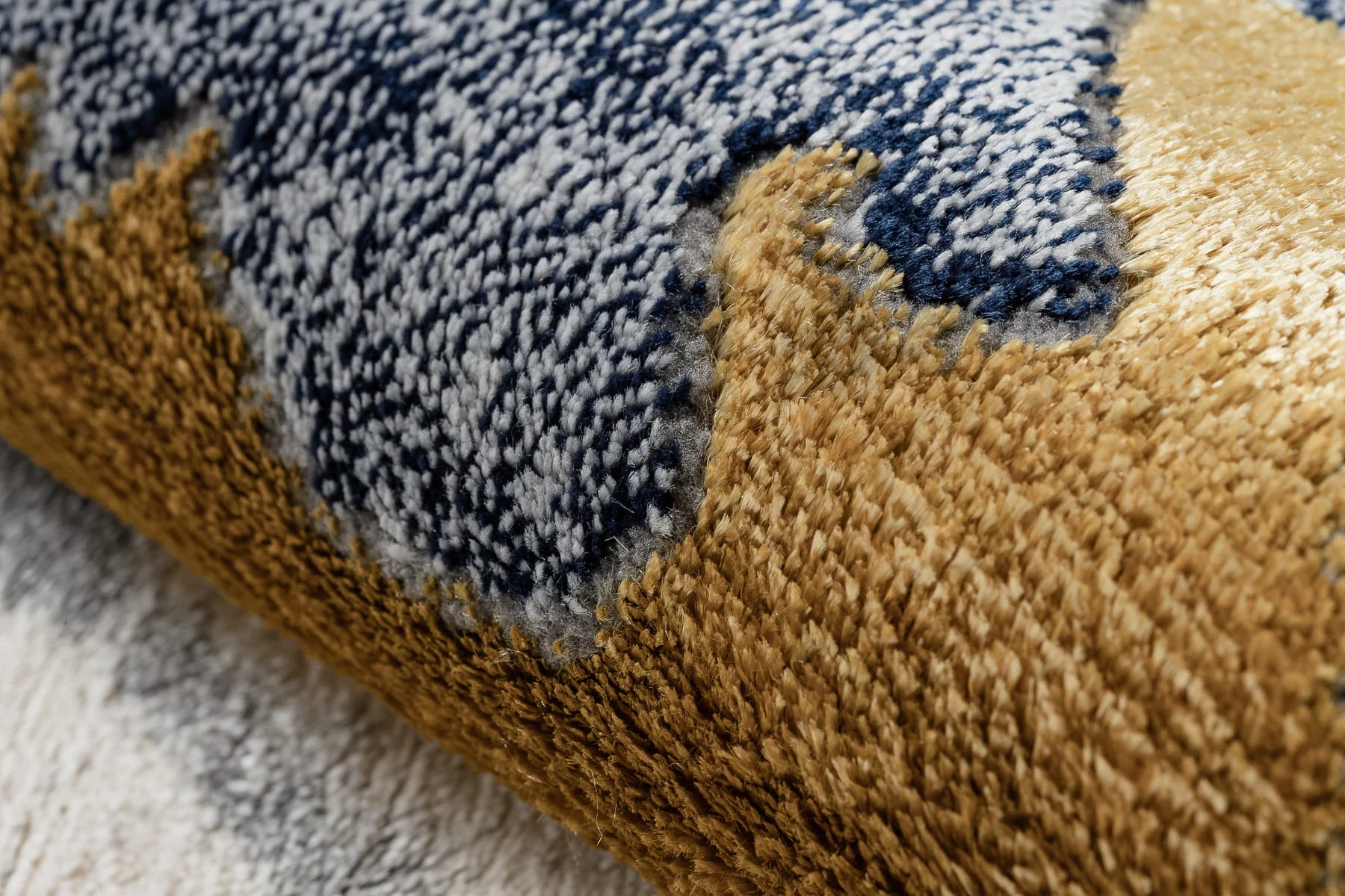 Granatowy dywan z abstrakcyjnym wzorem i złotymi akcentami, który nada wnętrzu elegancki i nowoczesny charakter.