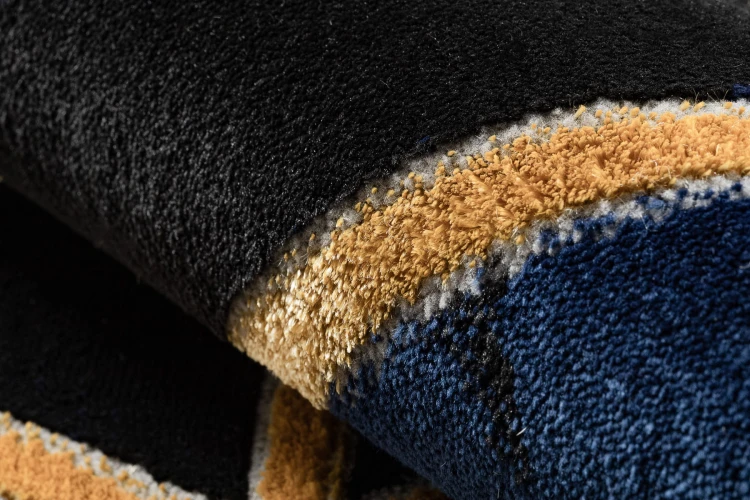 Złoto-niebieski dywan z geometrycznym wzorem, który nada salonowi elegancki i nowoczesny charakter.