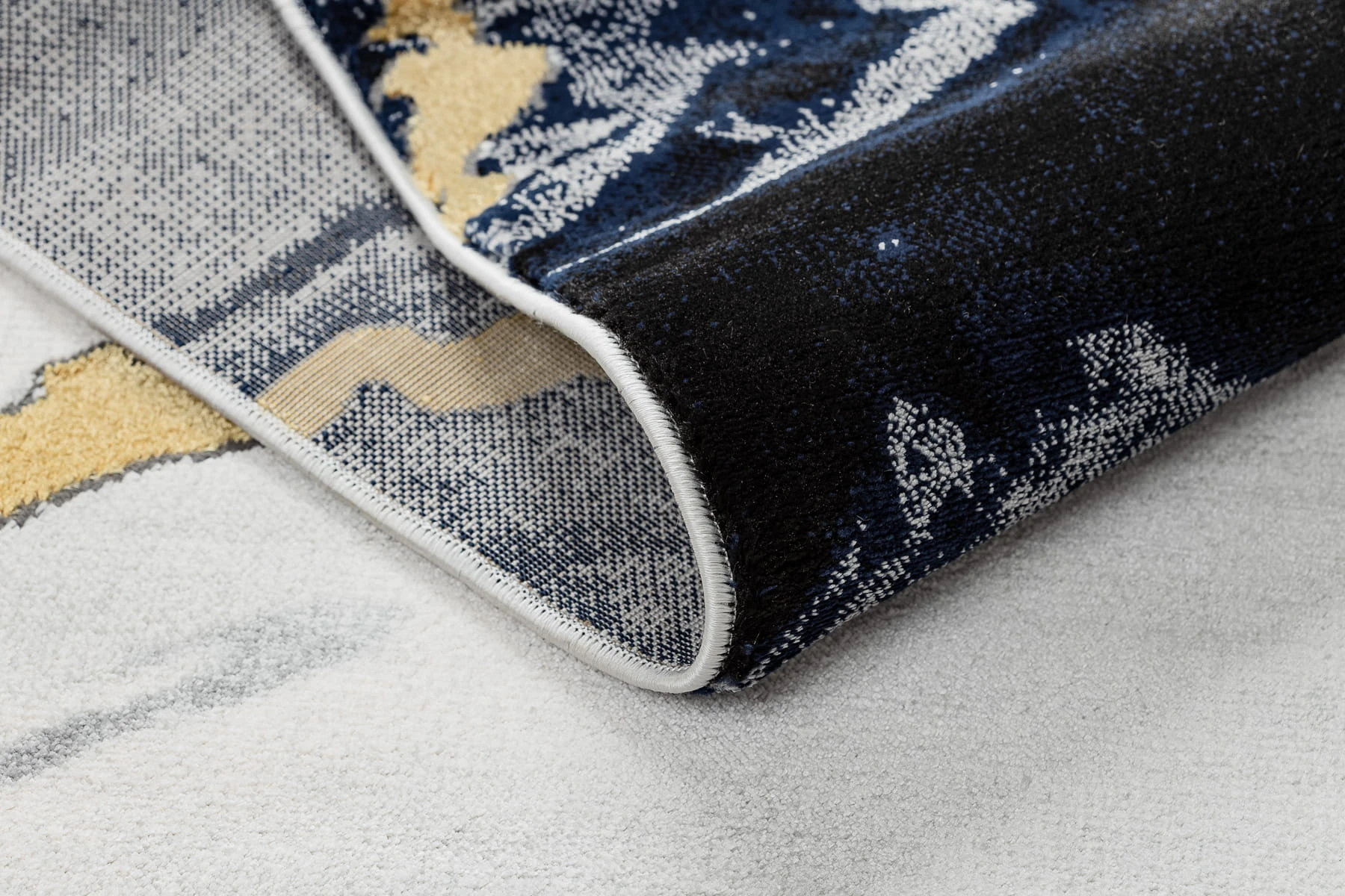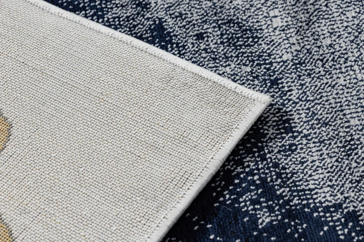 Granatowy dywan z abstrakcyjnym wzorem marmurkowym i złotymi akcentami, który doda korytarzowi elegancki charakter.