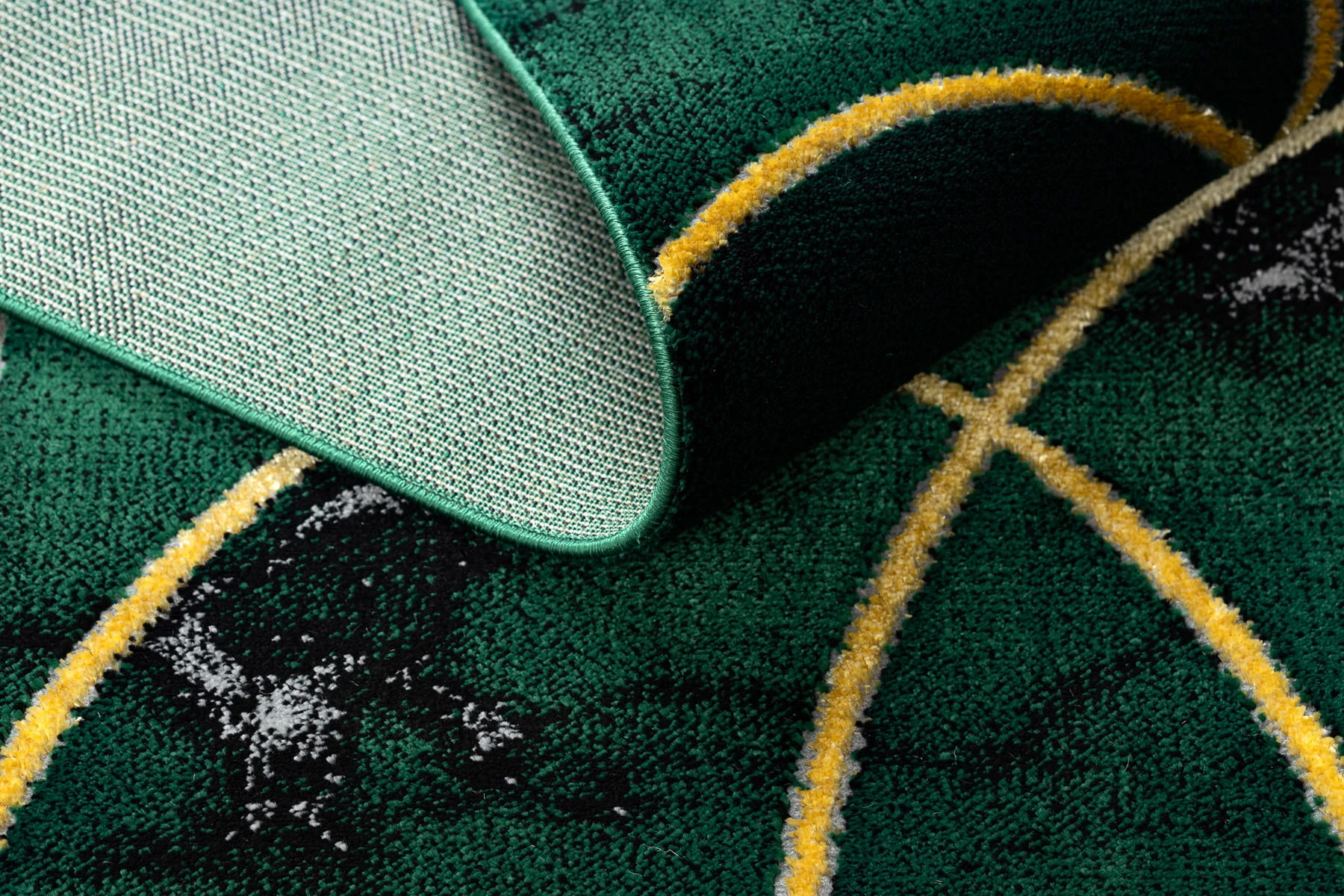 Prostokątny dywan w butelkowej zieleni z abstrakcyjnym wzorem w odcieniu złota, który doda salonowi elegancki i nowoczesny charakter.