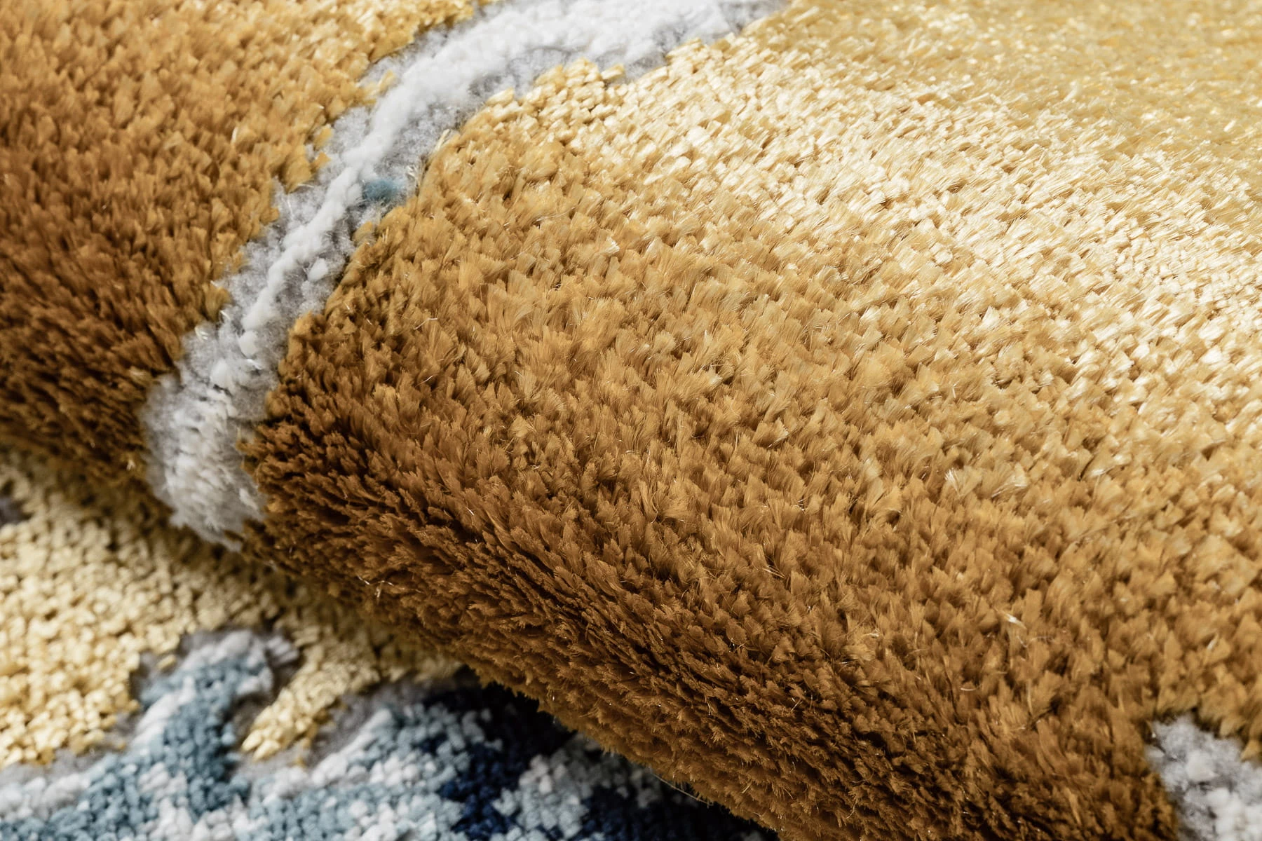 Niebiesko-złoty dywan z abstrakcyjnym wzorem, który nada salonowi elegancki i wyrazisty charakter.