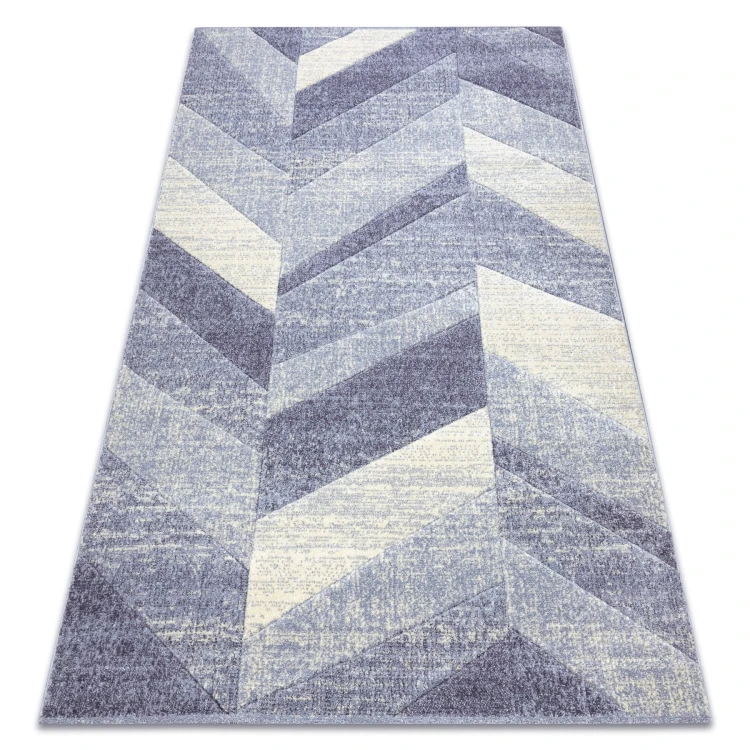 Beżowy dywan z geometrycznym wzorem jodełki i fioletowymi akcentami, który wprowadzi do salonu elegancką harmonię kolorów.