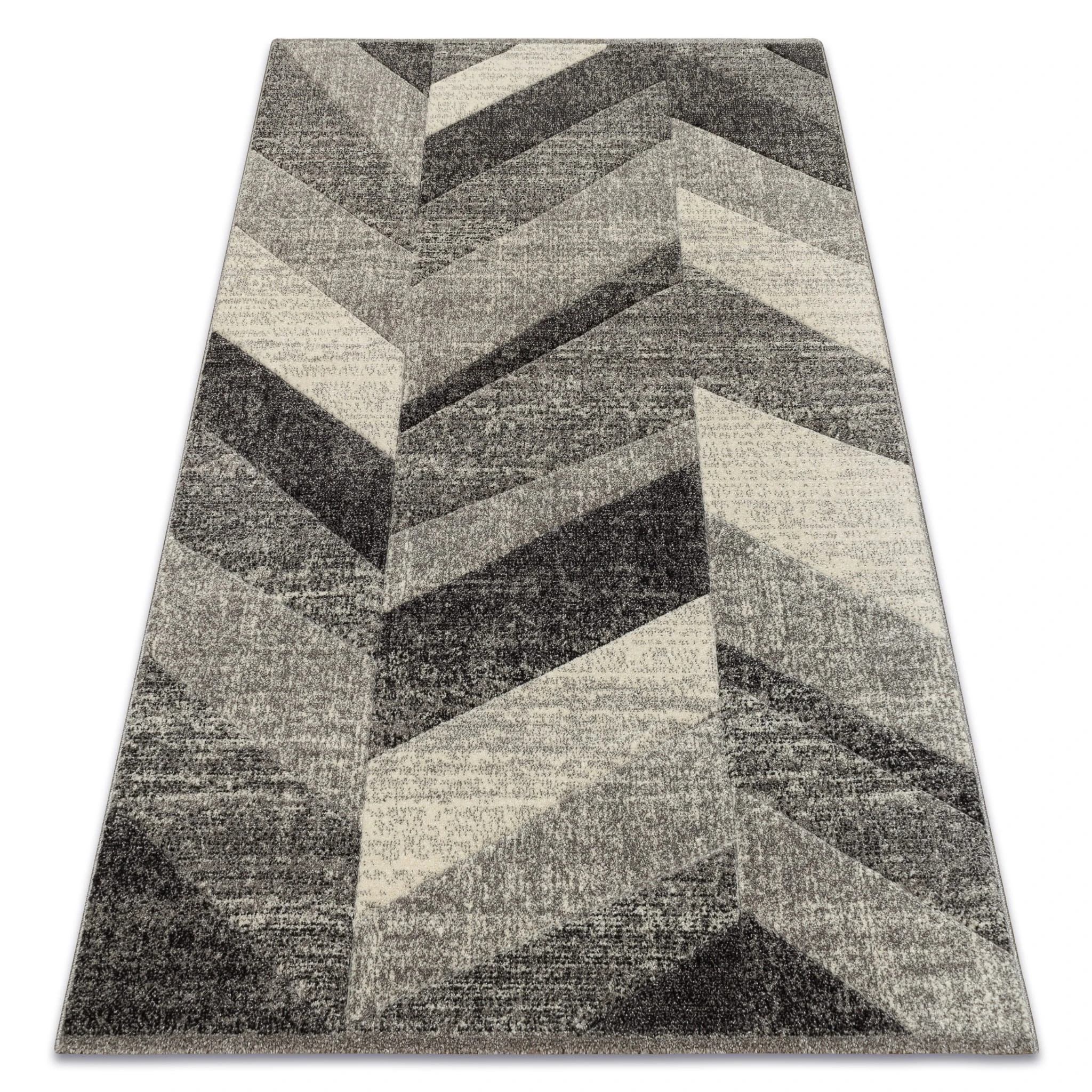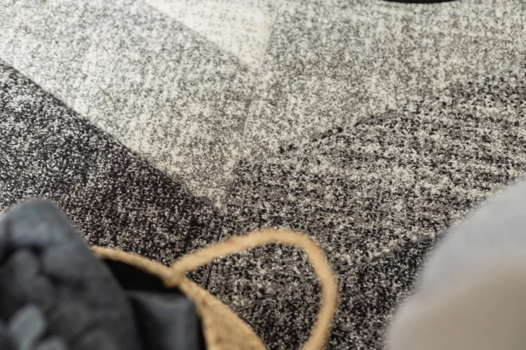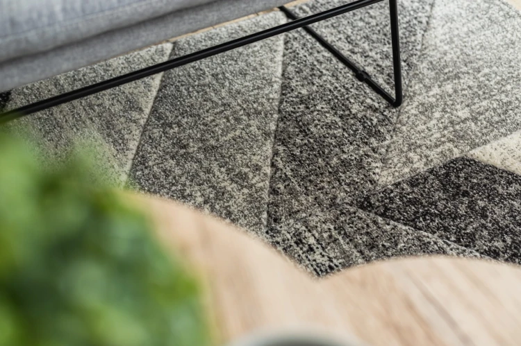 Szary dywan z klasycznym wzorem jodełki, który doda wnętrzu elegancki, uporządkowany charakter.