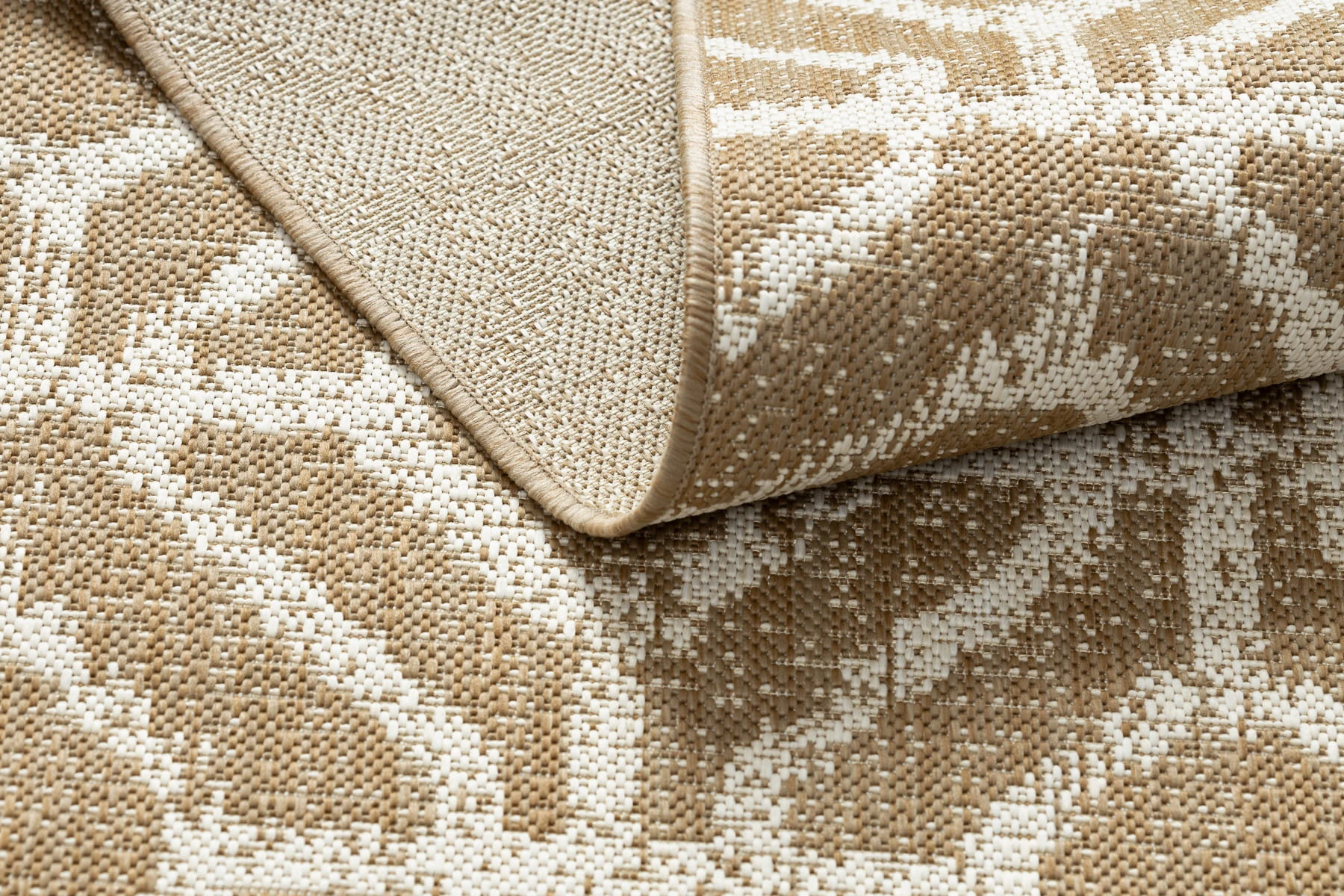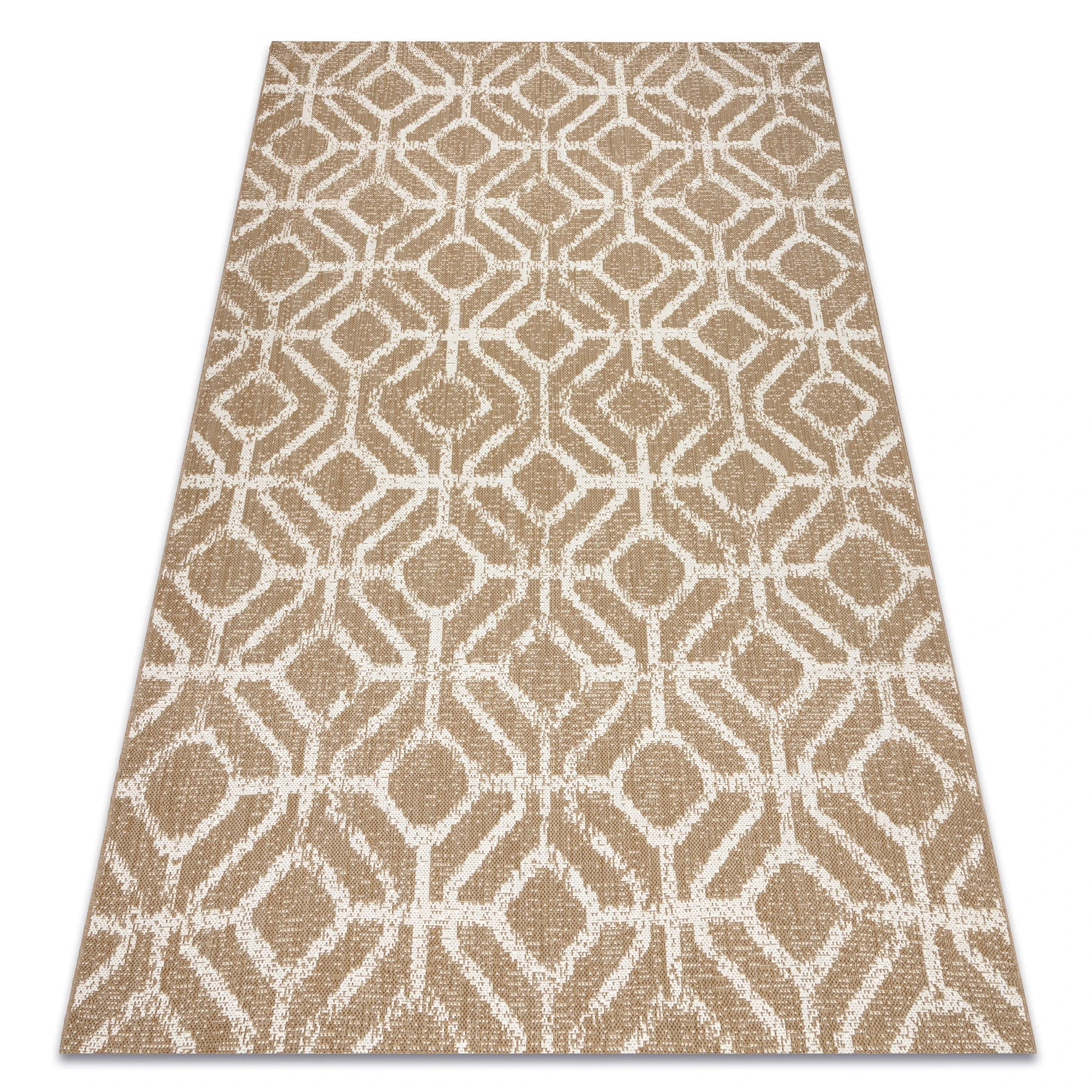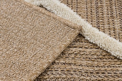 Sznurkowy dywan w odcieniach beżu, odporny na warunki atmosferyczne, idealny na taras i balkon.