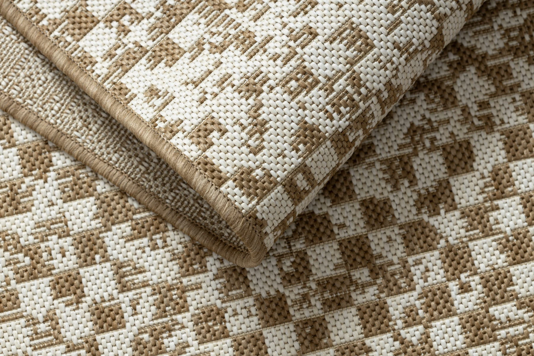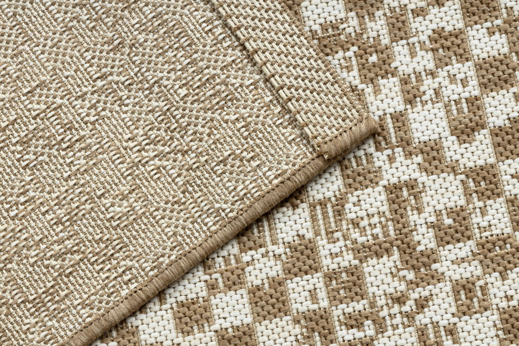 Sznurkowy dywan w odcieniach beżu, odporny na warunki atmosferyczne, idealny na taras i balkon.