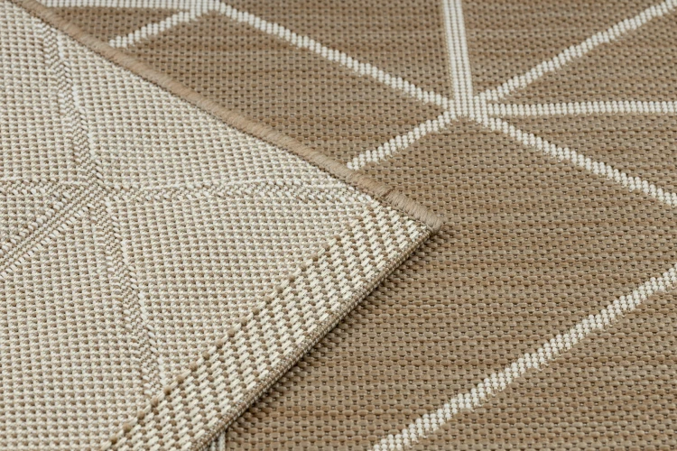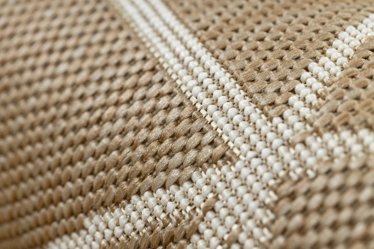 Sznurkowy dywan w odcieniach beżu, odporny na warunki atmosferyczne, idealny na taras i balkon.