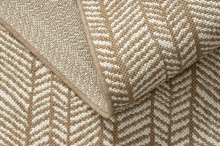 Sznurkowy dywan w odcieniach beżu, odporny na warunki atmosferyczne, idealny na taras i balkon.