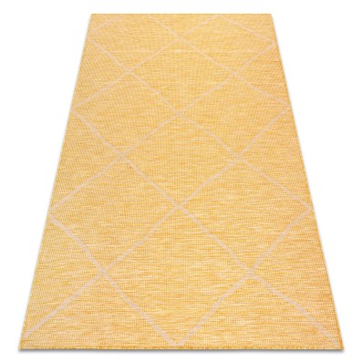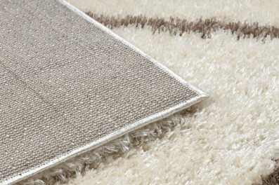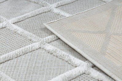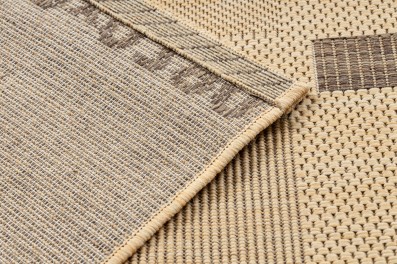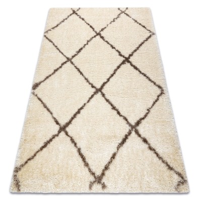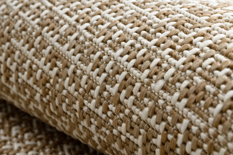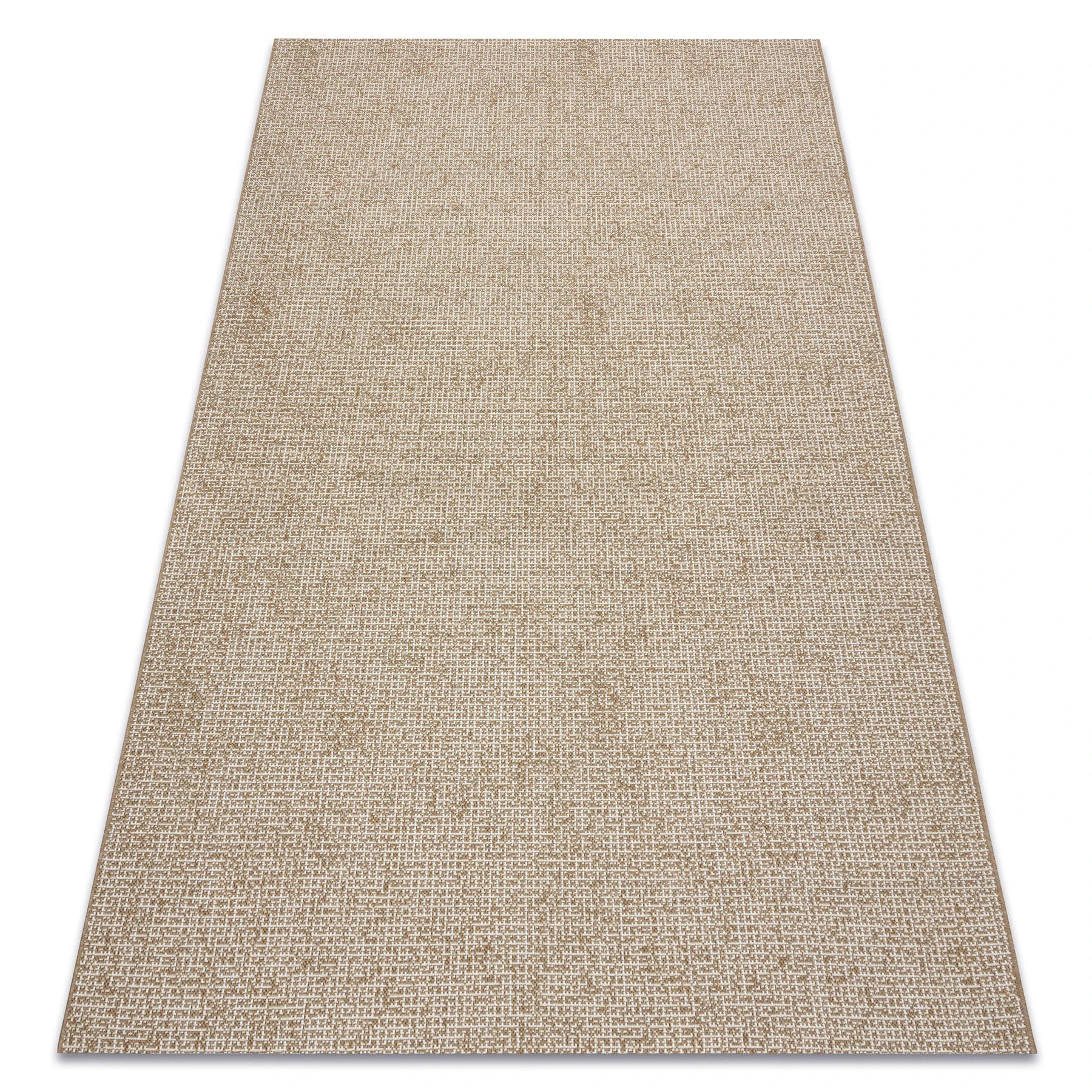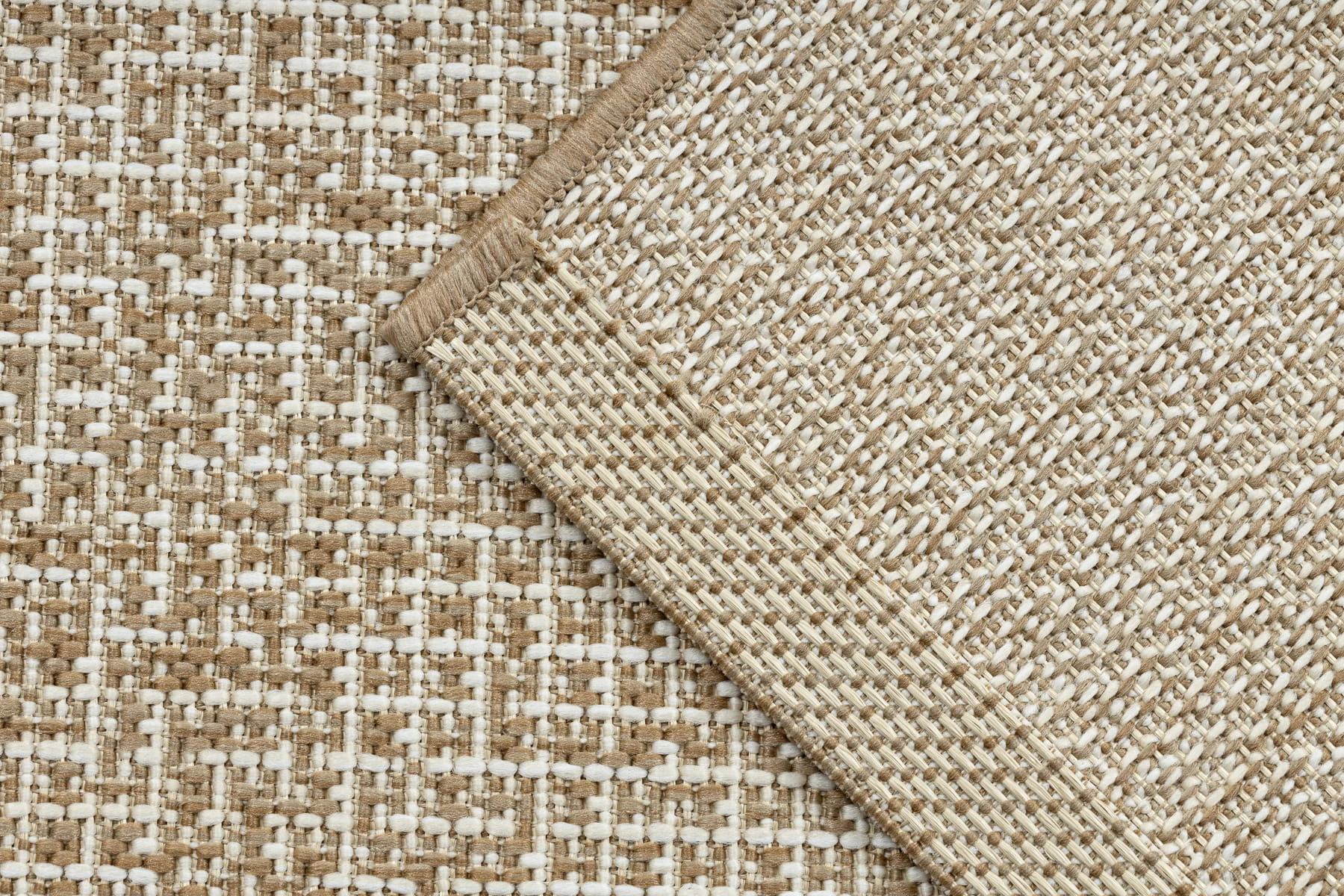 Beżowy dywan z wzorem kratki, który idealnie sprawdzi się w korytarzu, dodając wnętrzu elegancki charakter.
