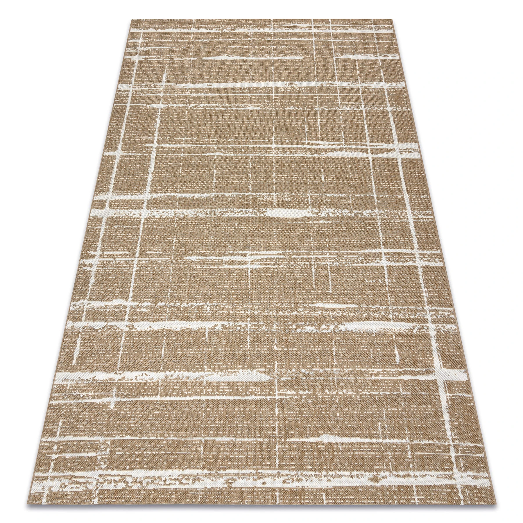 Sznurkowy dywan w beżową kratkę, odporny na warunki atmosferyczne, idealny na taras i balkon.