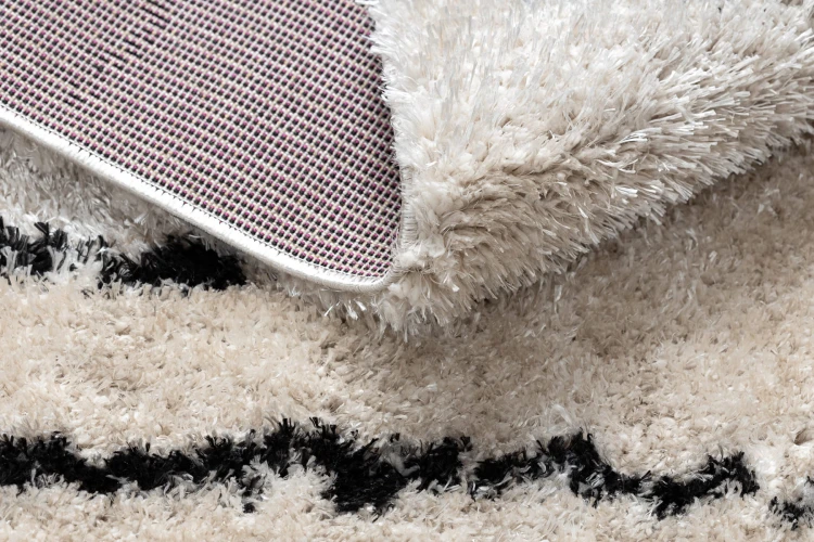 Kremowo-antracytowy dywan shaggy z runem 50 mm w pasiasty wzór, który stworzy w salonie przytulną atmosferę z eleganckim akcentem.