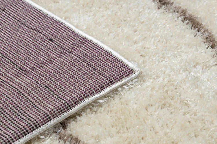 Beżowy dywan shaggy z runem 50 mm w delikatne paski, który doda salonowi przytulności i ciepłego charakteru.
