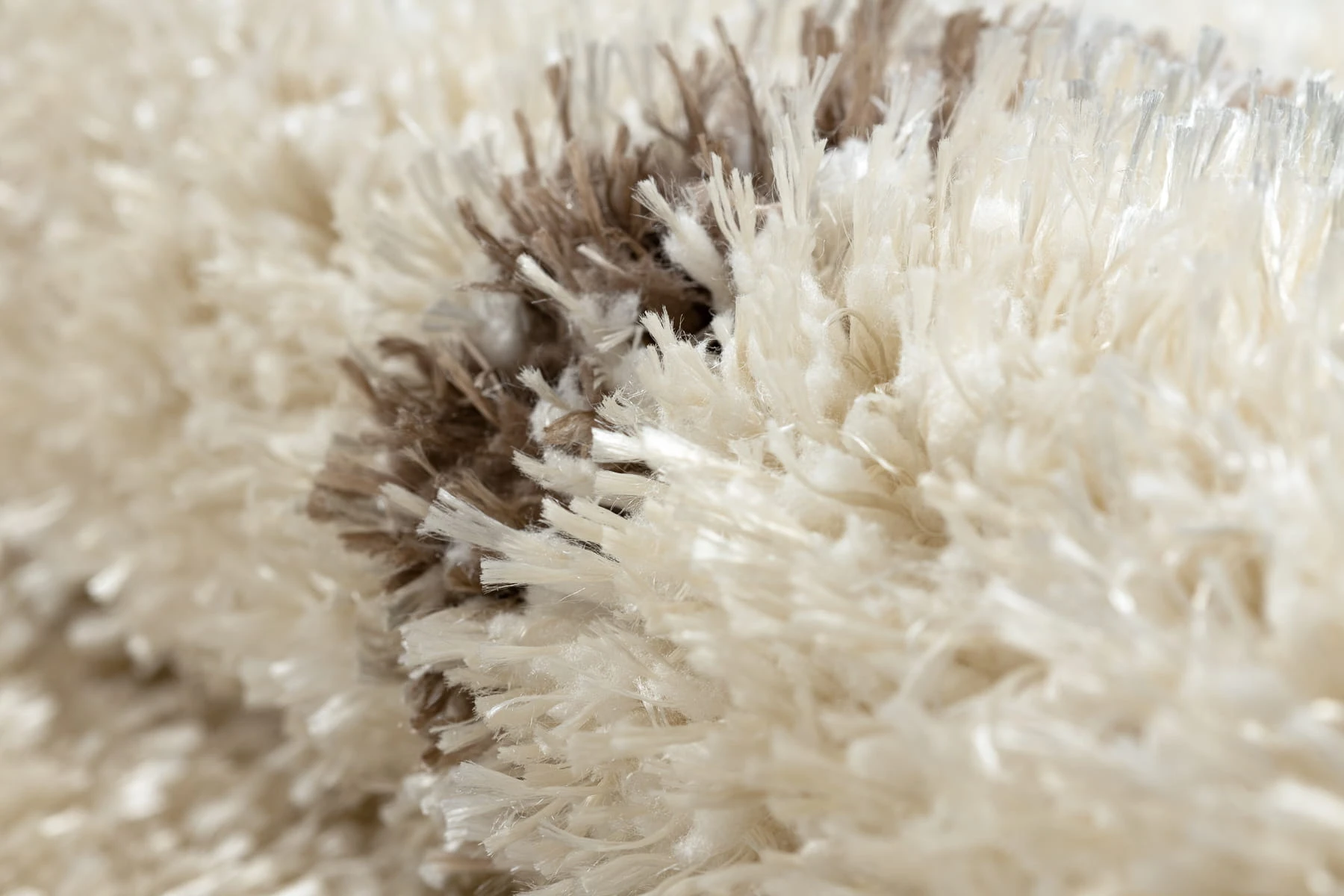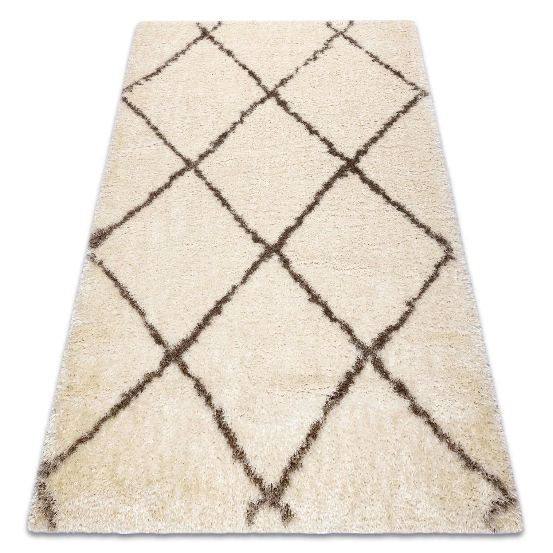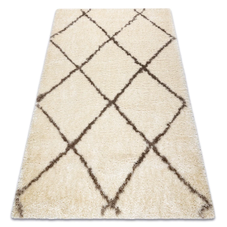 Kremowo-beżowy dywan shaggy z runem 50 mm i wzorem w kratkę, który doda wnętrzu przytulności i ciepłego charakteru.
