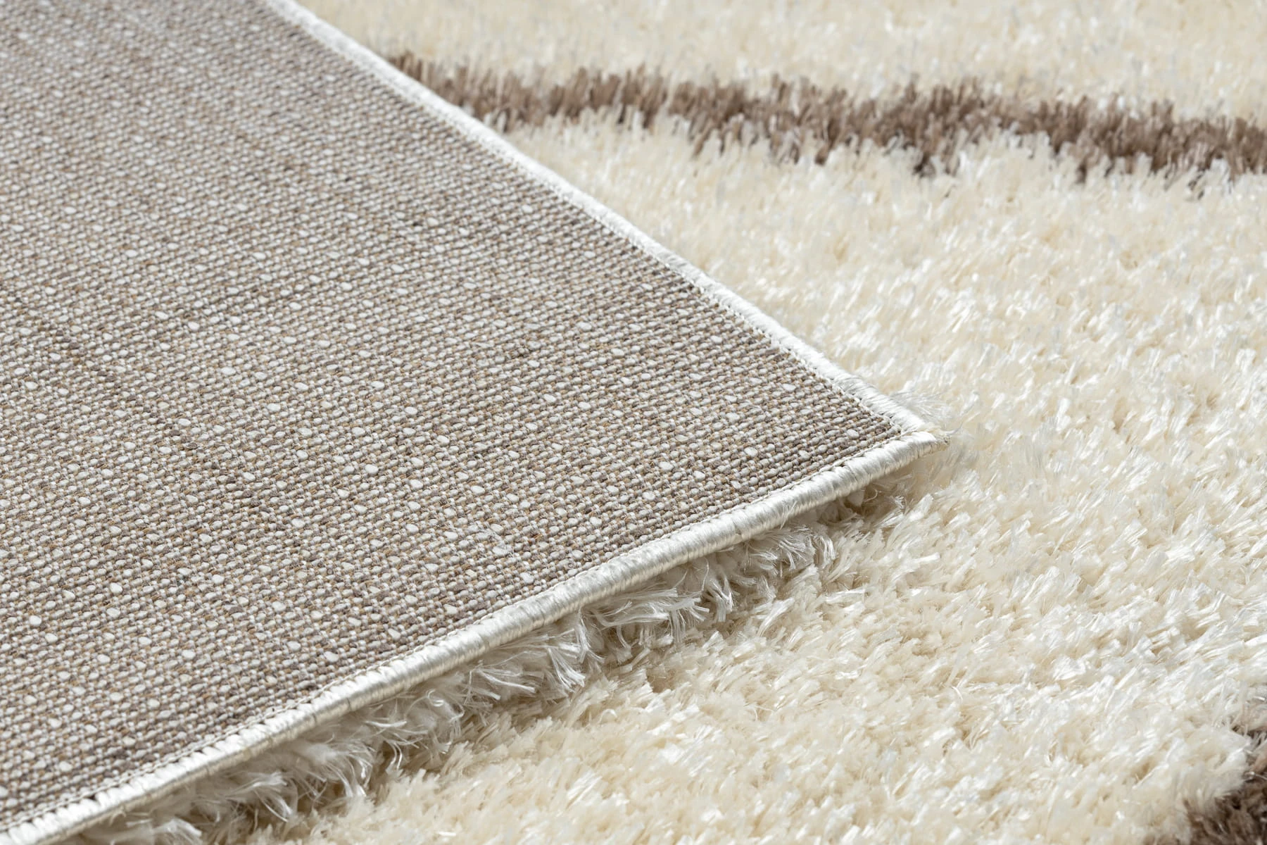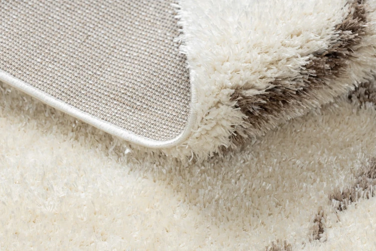Kremowo-beżowy dywan shaggy z runem 50 mm i wzorem w kratkę, który doda wnętrzu przytulności i ciepłego charakteru.