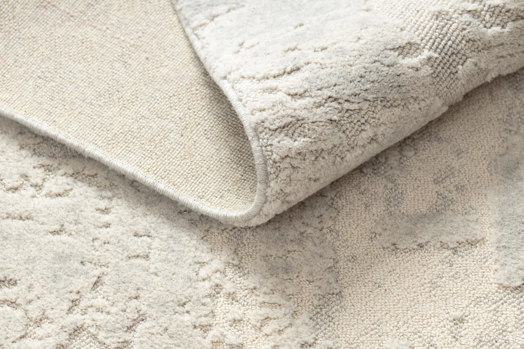 Kremowo-szary dywan z abstrakcyjnym wzorem, który doskonale wpisze się w nowoczesny salon lub pokój.