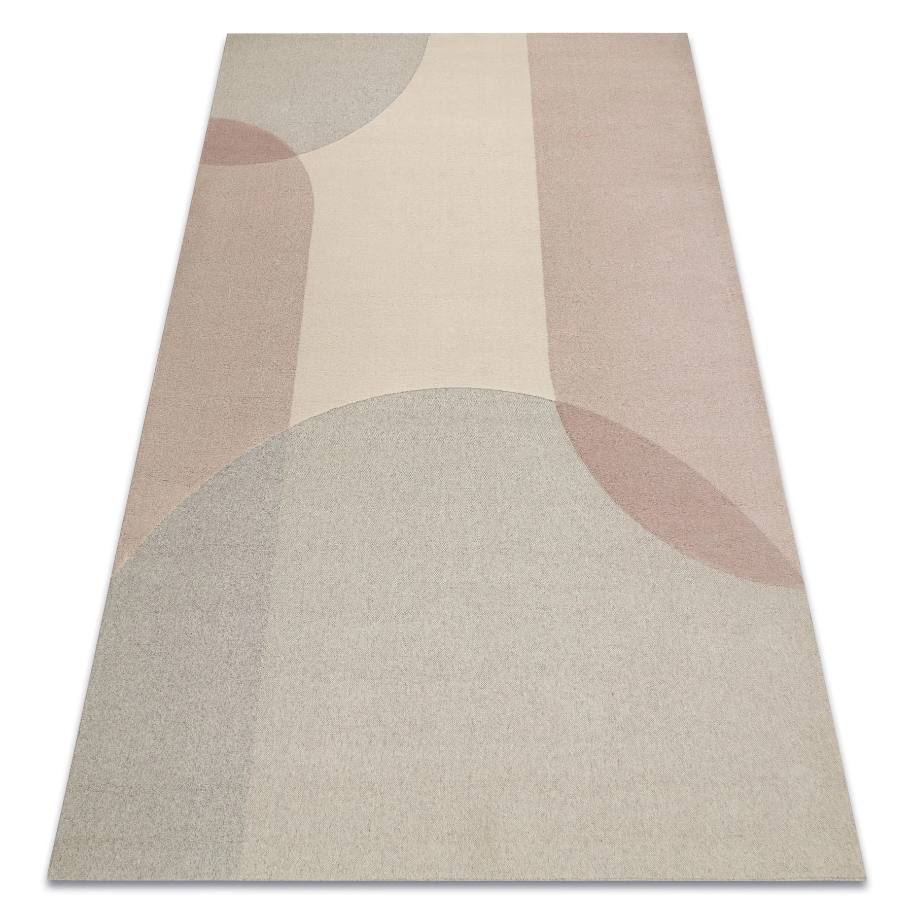 Beżowy dywan z geometrycznym wzorem w delikatnych odcieniach różu, który wprowadzi do wnętrza subtelną elegancję i ciepły charakter.
