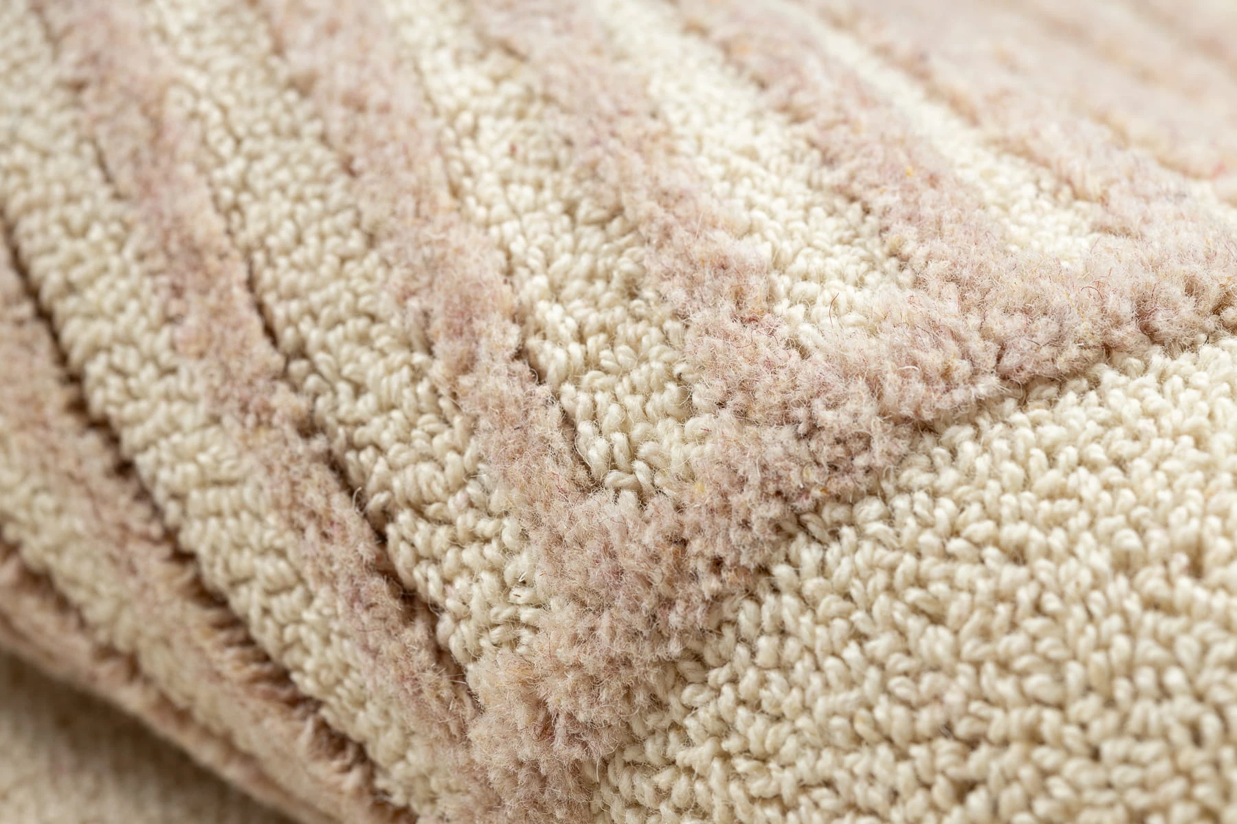 Beżowy dywan z geometrycznym wzorem i różowymi akcentami, który doda wnętrzu subtelnej elegancji i nowoczesnego charakteru.