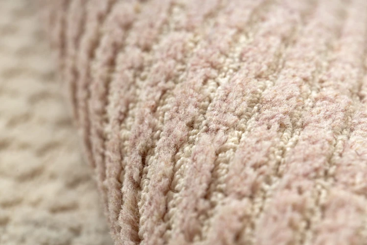 Beżowo-różowy dywan z geometrycznym wzorem, który doda salonowi subtelny, nowoczesny charakter.