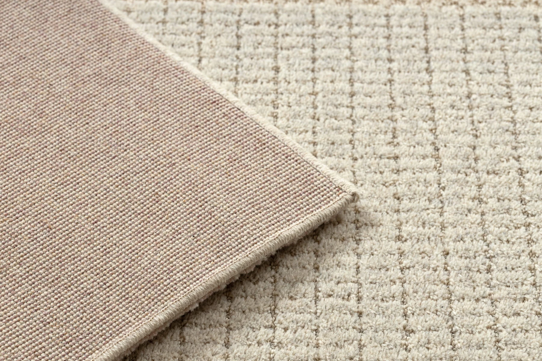 Beżowo-różowy dywan z geometrycznym wzorem, który doda salonowi subtelny, nowoczesny charakter.