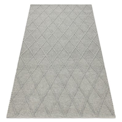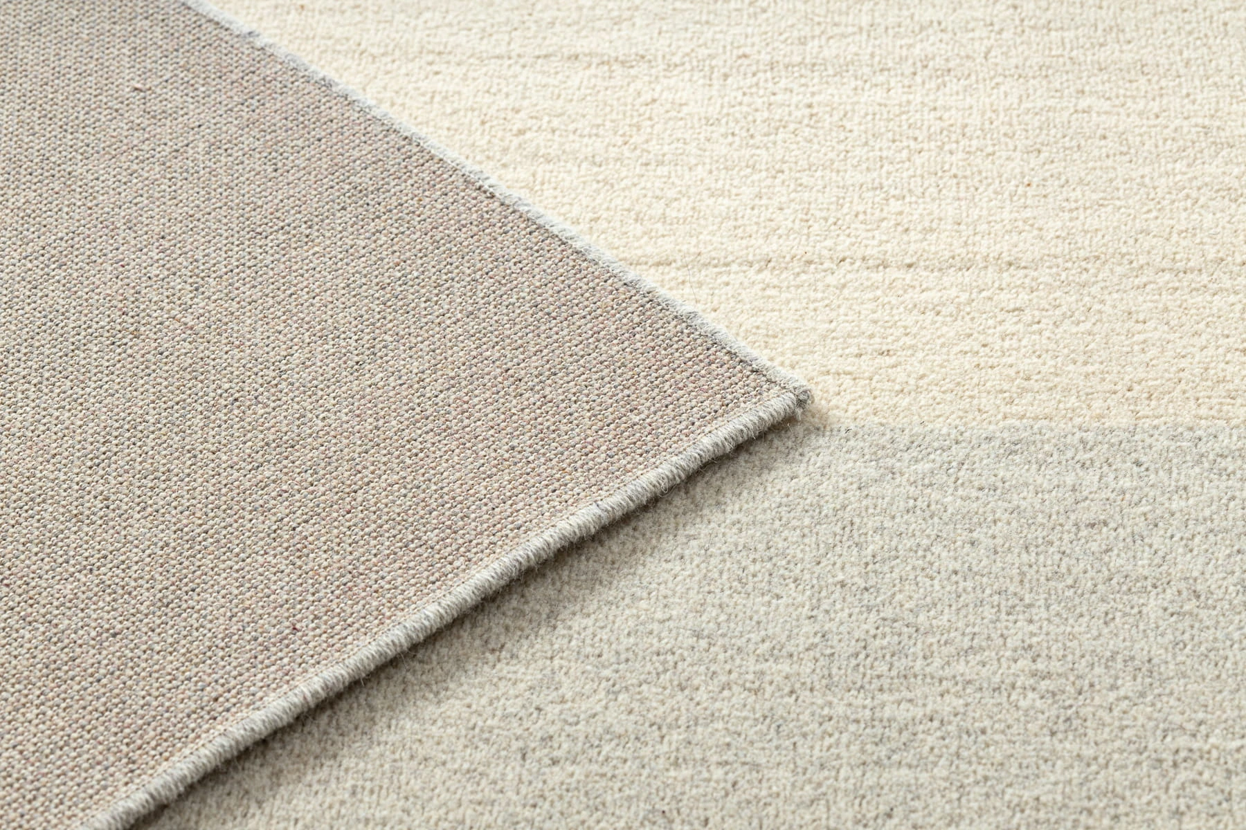 Szaro-beżowy dywan z wełny z geometrycznym wzorem, który doda salonowi elegancki charakter w stylu nowoczesnym.