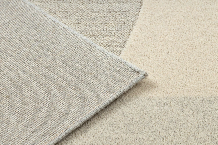 Wełniany dywan w beżowo-szarej kolorystyce z geometrycznym wzorem, który wprowadzi do salonu elegancką harmonię barw.