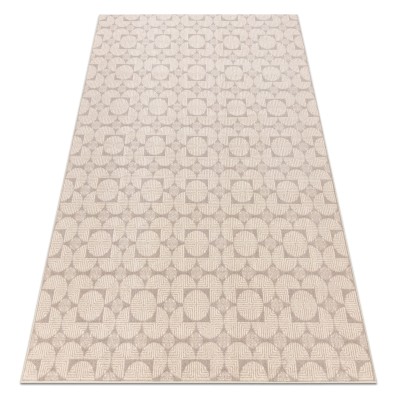 Beżowy dywan z geometrycznym wzorem, który nadaje salonowi nowoczesny charakter i stonowaną elegancję.
