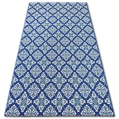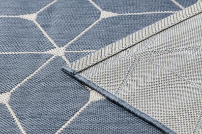 Niebieski dywan z wełny z geometrycznym wzorem, który doskonale sprawdzi się w salonie, dodając wnętrzu elegancki charakter.