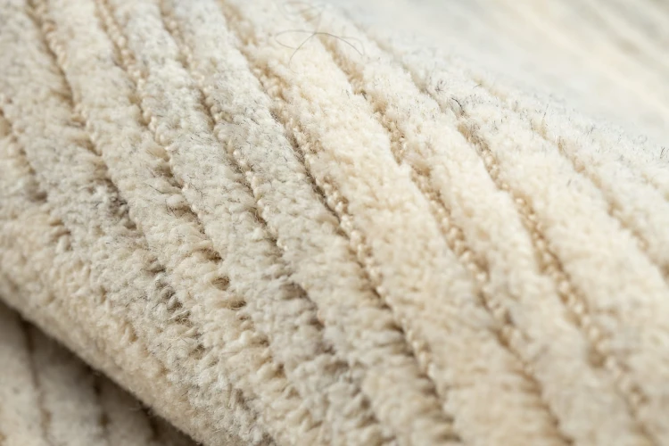 Szaro-kremowy dywan z wełny z abstrakcyjnym wzorem linii, który doda salonowi nowoczesny charakter i elegancję.