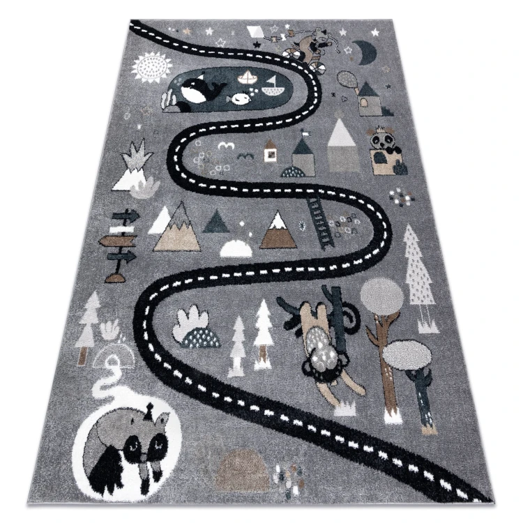 Szary dywan z motywem zwierzęcym, który wprowadzi do pokoju dziecka lub salonu ciekawy akcent przyrodniczy.