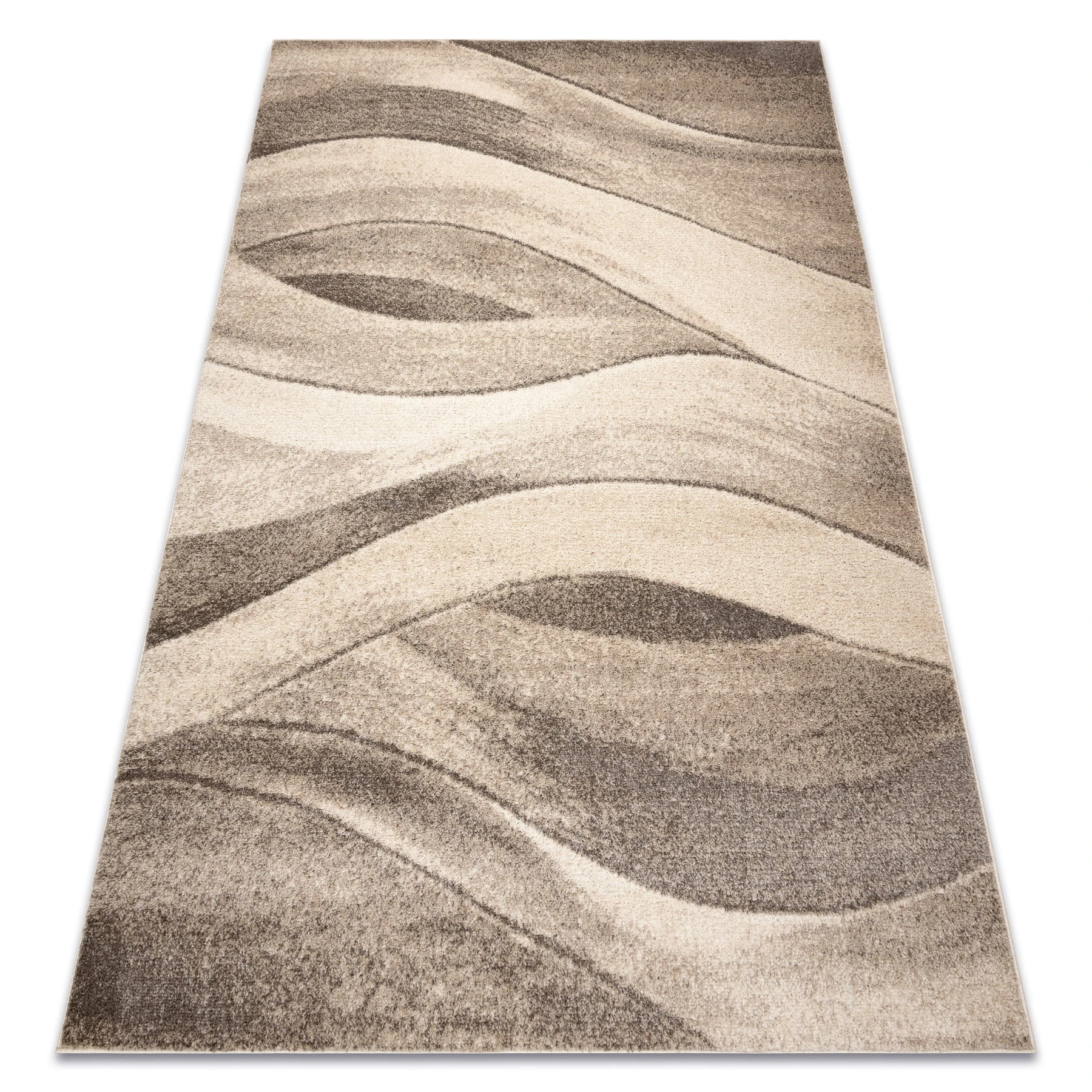 Beżowo-kremowy dywan z abstrakcyjnym wzorem, który doskonale wpisze się w nowoczesny salon lub pokój.