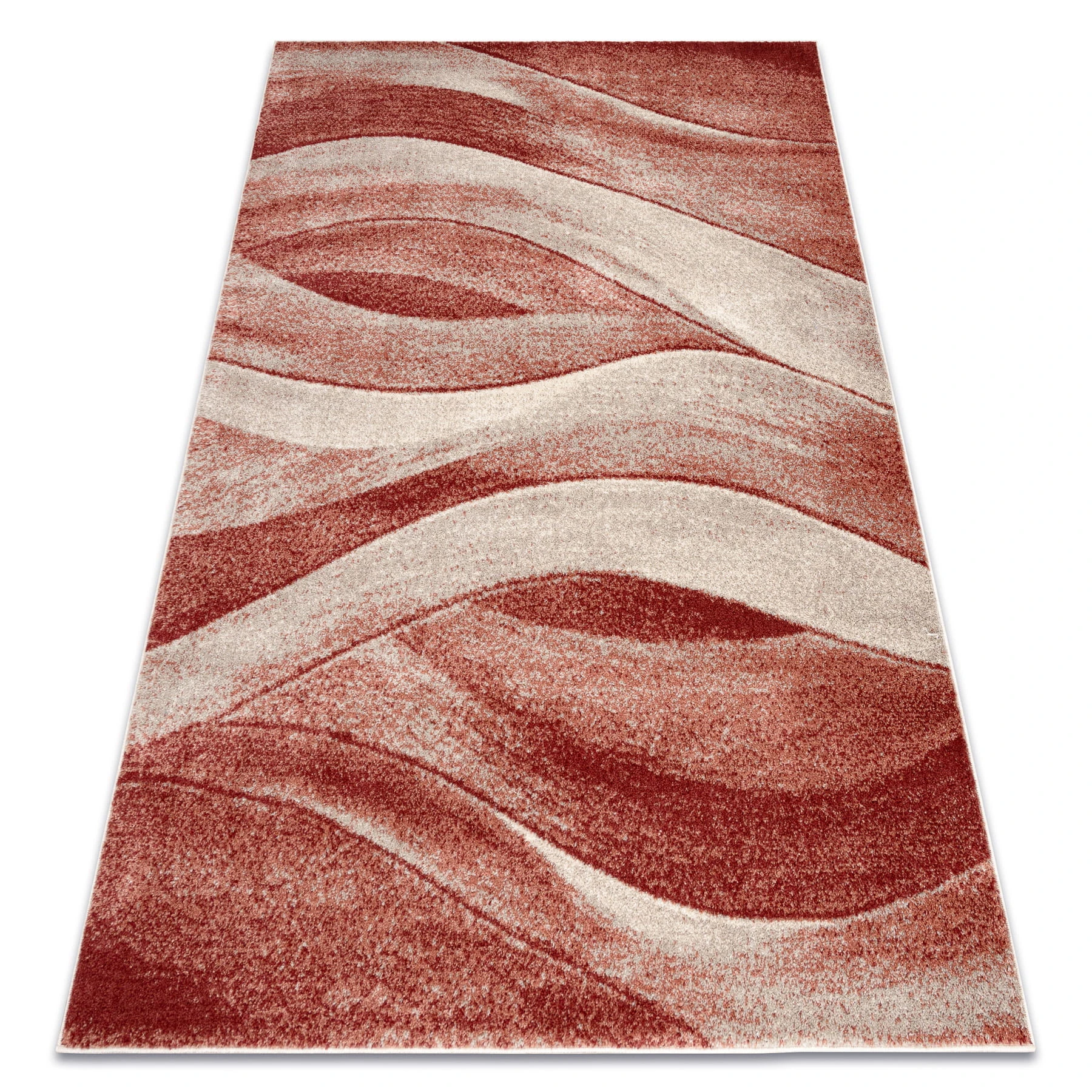 Terakotowy dywan z abstrakcyjnym wzorem fal, który wniesie do salonu ciepły, energetyczny akcent.