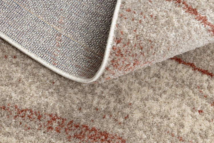 Kremowy dywan z abstrakcyjnym wzorem fal w terakotowym odcieniu, który wniesie do salonu nowoczesny i ciepły charakter.