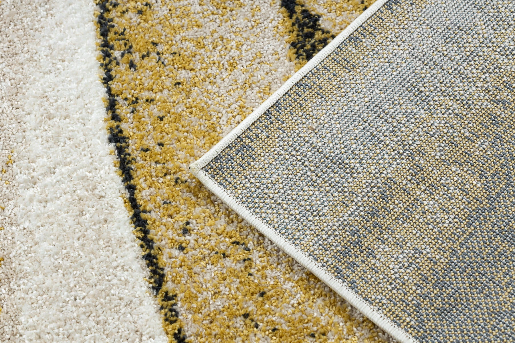 Żółto-kremowy dywan z abstrakcyjnym wzorem, który ożywi salon ciepłym, słonecznym akcentem.