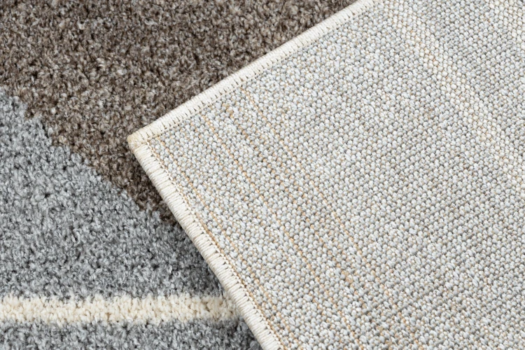 Beżowo-brązowy dywan z geometrycznym wzorem, który doskonale sprawdzi się w korytarzu, dodając mu elegancki i uporządkowany charakter.
