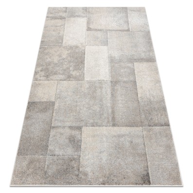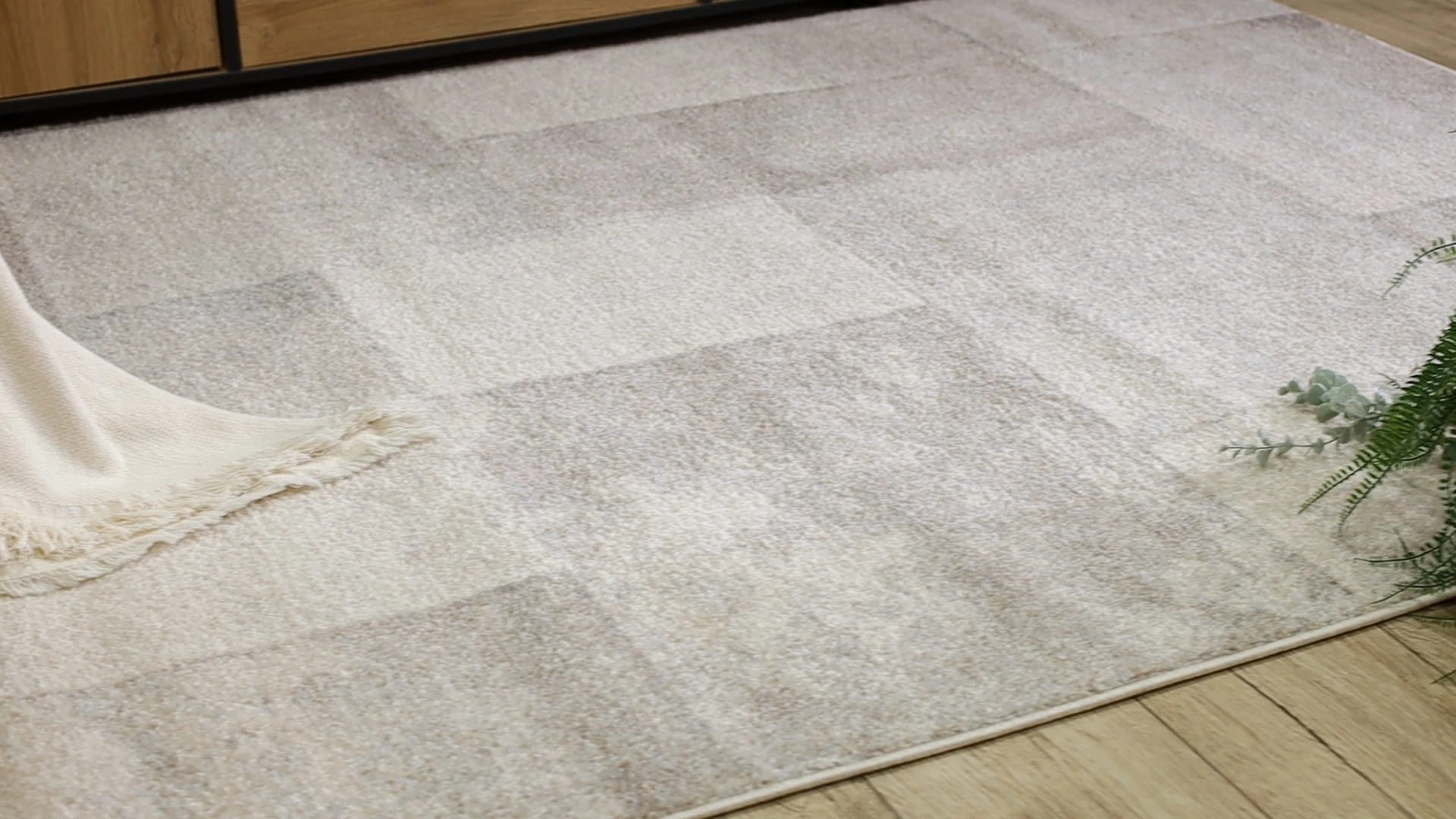 Beżowy dywan z geometrycznym wzorem, który doskonale wpisze się w salon i doda mu elegancki, nowoczesny charakter.