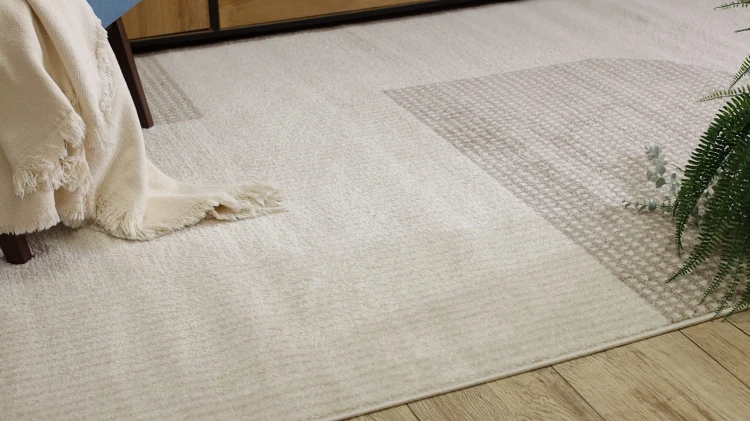 Kremowo-beżowy dywan z geometrycznym wzorem, który doskonale sprawdzi się w salonie, dodając wnętrzu nowoczesnego charakteru.